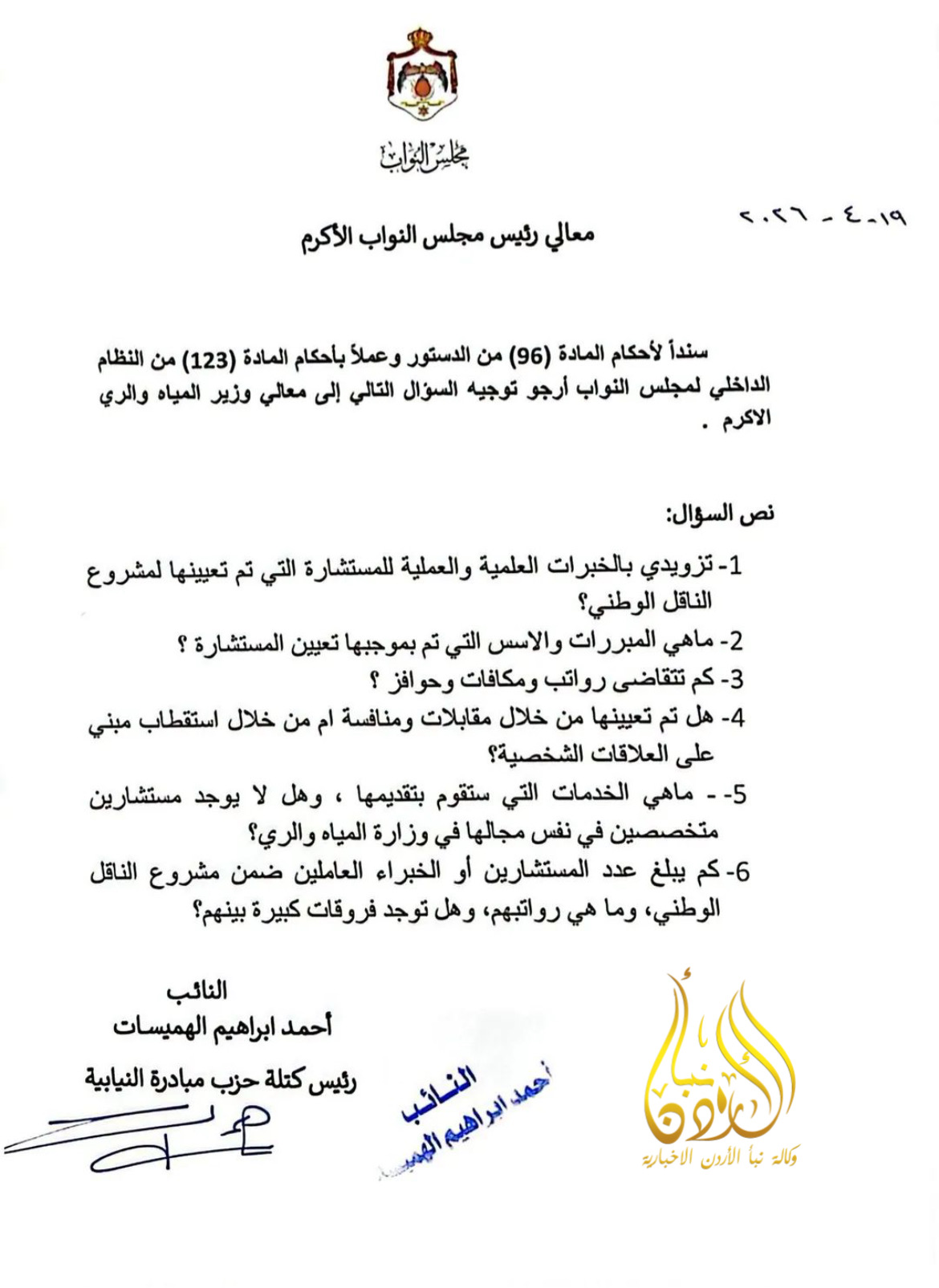 وجه النائب أحمد الهميسات سؤالاً نيابياً إلى وزير المياه والري، طالب فيه بتوضيح تفاصيل تعيين مستشارة ضمن مشروع الناقل الوطني.