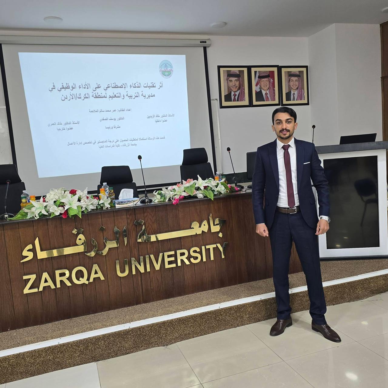 نوقشت في كلية الاقتصاد والعلوم الإدارية جامعة الزرقاء قسم إدارة الأعمال رسالة ماجستير للباحث عمر محمد الملاحمة بعنوان " أثر تقنيات الذكاء الاصطناعي على الأداء الوظيفي في مديرية التربية والتعليم لمنطقة الكرك، وتكونت لجنة المناقشة من الدكتور يوسف الصفدي مشرفا وعضوية الاستاذ الدكتور خالد الزيديين جامعة الزرقاء والأستاذ الدكتور خالد العمري جامعة جدارا... وتكمن أهمية الدراسة بأثر الذكاء الاصطناعي في الأداء الوظيفي كونه من المستجدات الحديثة لمواكبة التطورات في إدارة الأعمال وعصر الانفجار المعرفي التكنولوجي.... وفي نهاية المناقشة أوصت اللجنة بإجازة الرسالة بتقدير إمتياز.