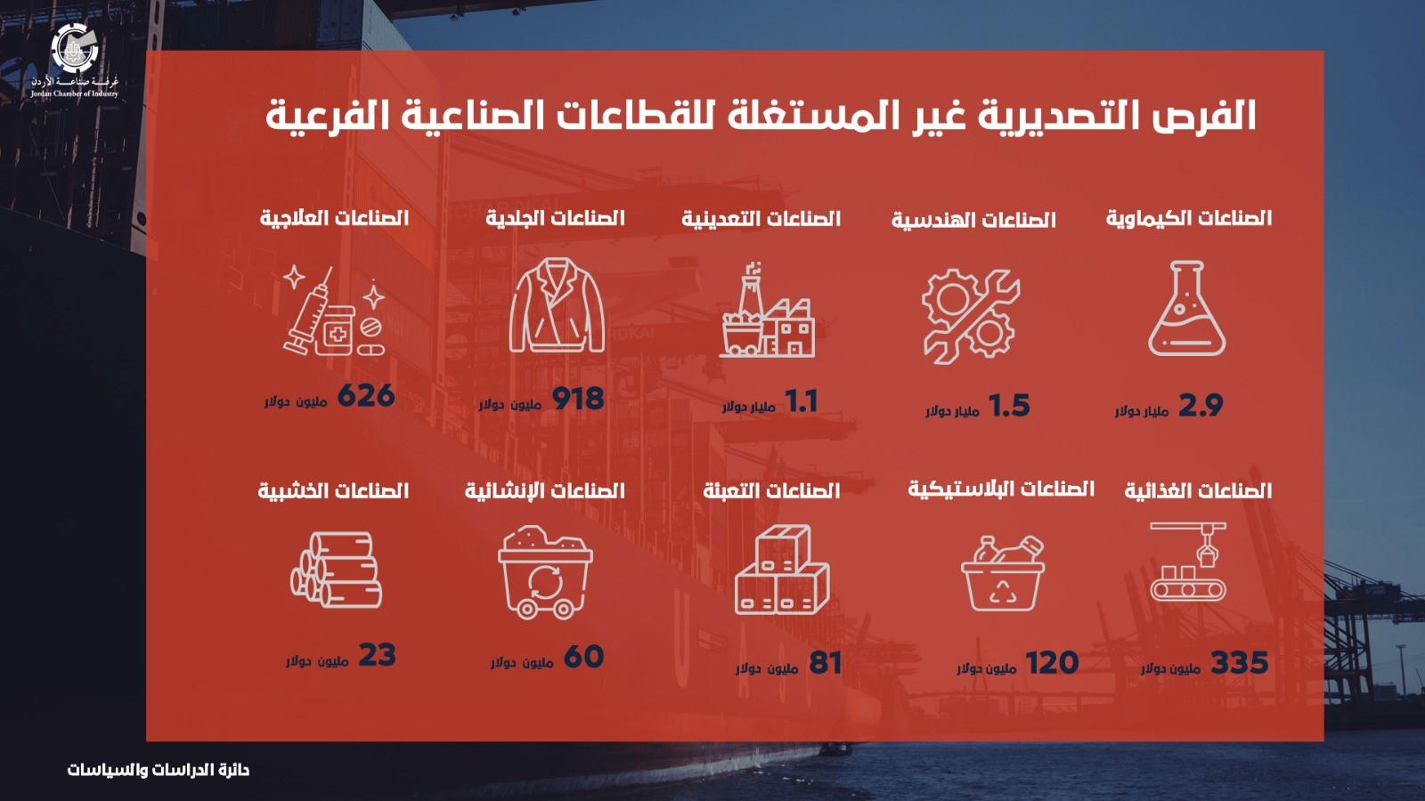 أطلقت غرفة صناعة الأردن تقريراً بعنوان "الأسواق الواعدة للصناعة الأردنية" في خطوة تهدف إلى دعم القطاع الصناعي وتمكين الشركات من تحديد الفرص التصديرية غير المستغلة والتوسع في الأسواق العالمية.