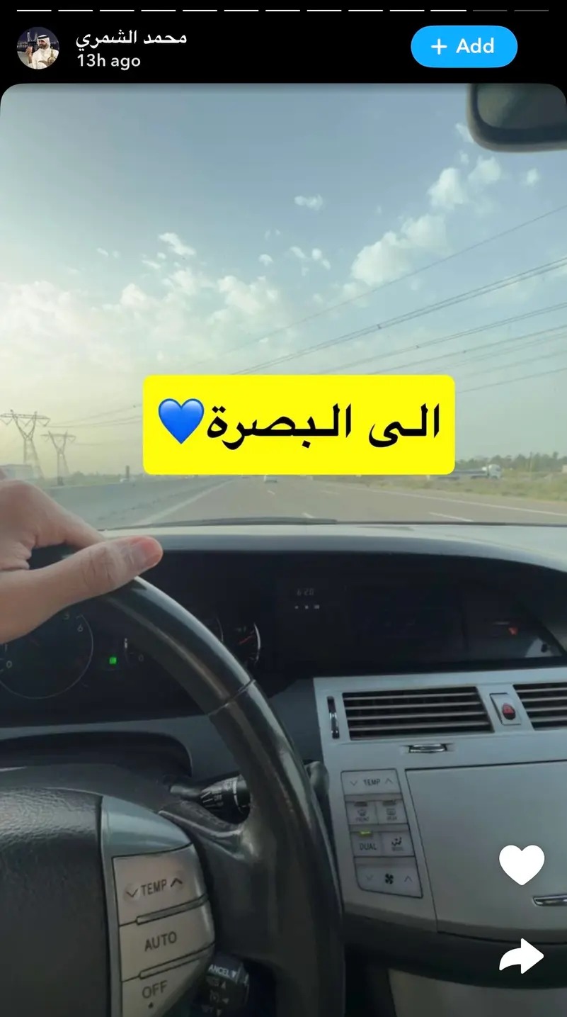 وفي الفيديو المصور، قال الشمري إنه سيأخذ فترة استراحة يتناول خلالها "الخبز والقهوة" ثم يستكمل الطريق.