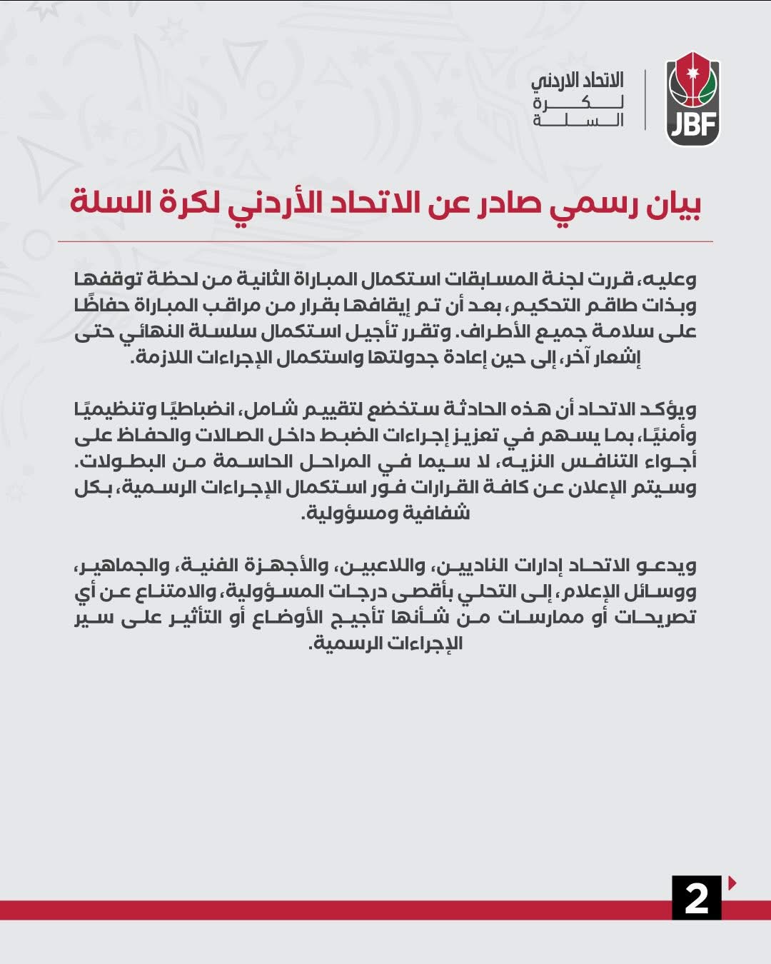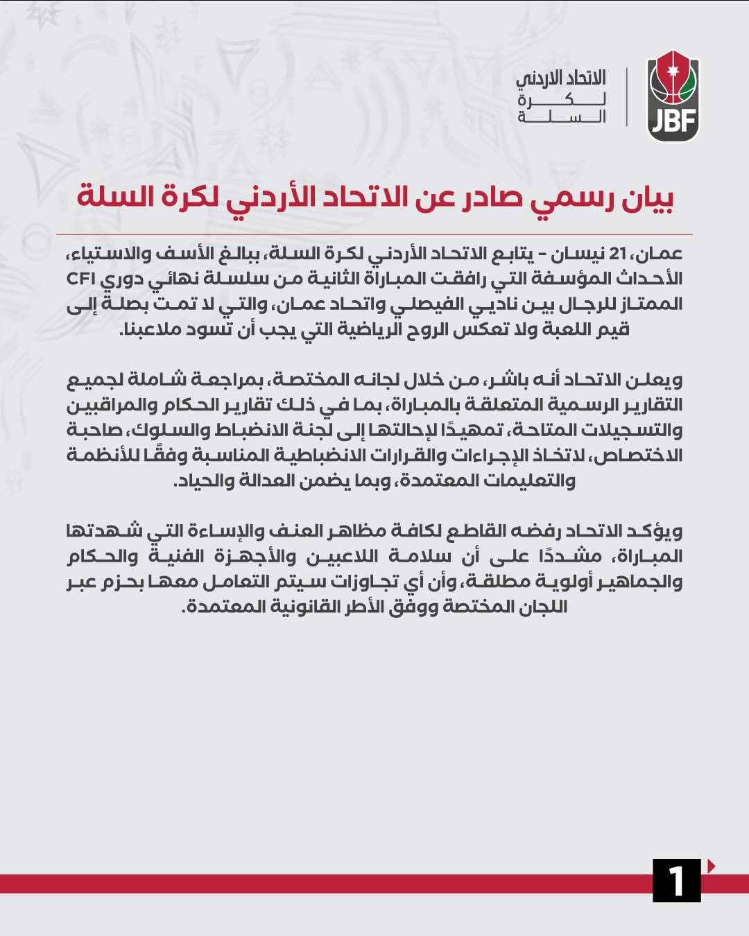 تالياً البيان رسمي صادر عن الاتحاد الأردني لكرة السلة حول أحداث المباراة الثانية من سلسلة نهائي دوري CFI الممتاز بين فريقي الفيصلي واتحاد عمان