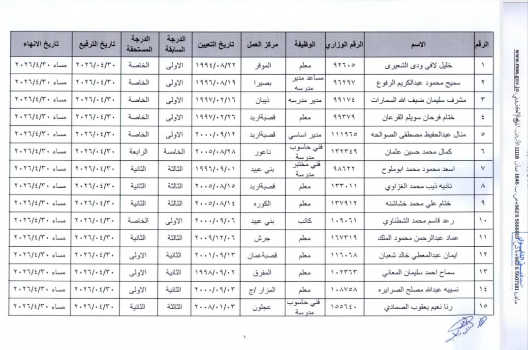 قرر وزير التربية والتعليم الدكتور عزمي محافظة ترفيع وانهاء خدمات المذكورين في الكشف المرفق اعتبارا من التاريخ المبين ازاء كل منهم بناء على طلبهم .