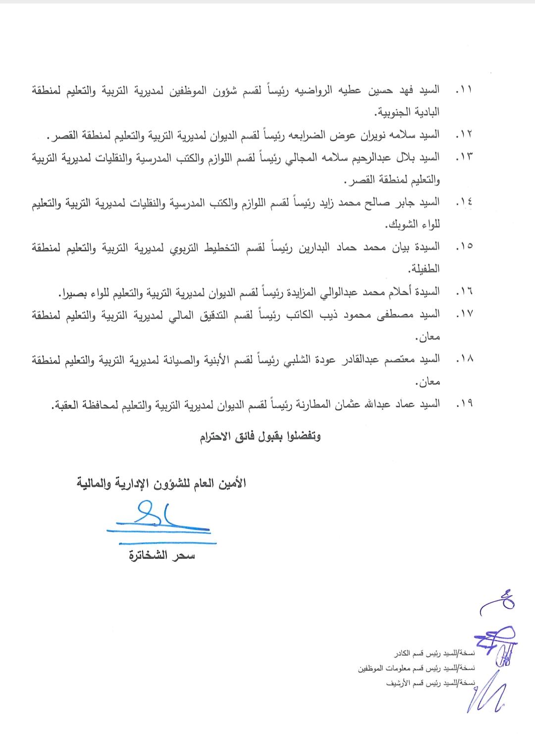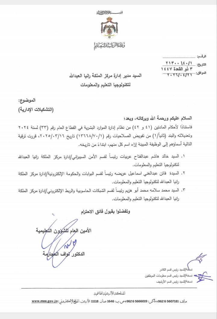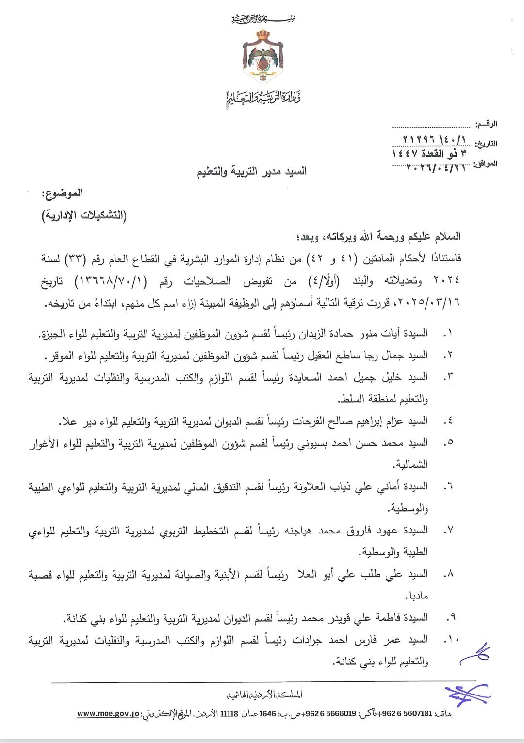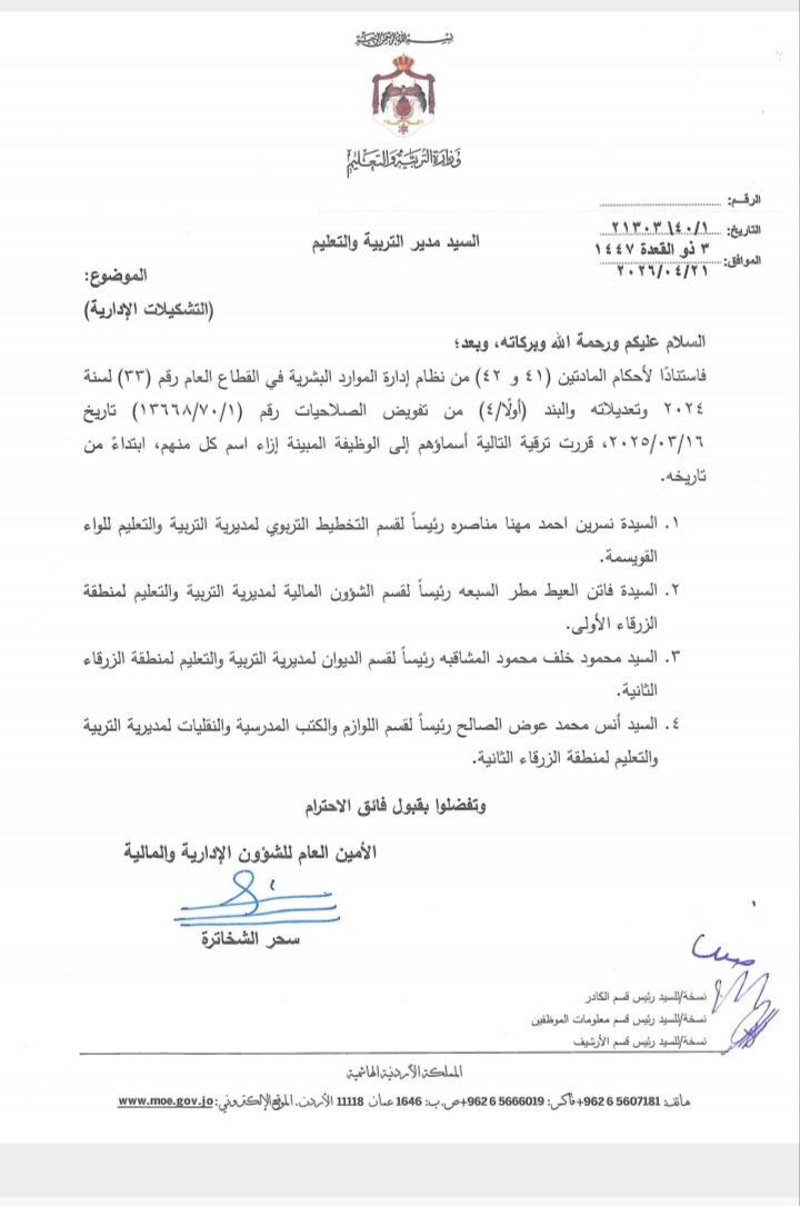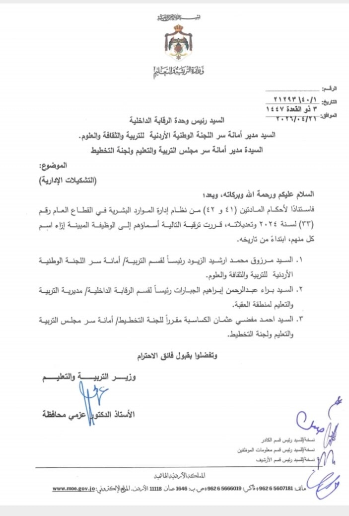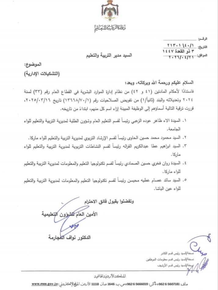 أجرت وزارة التربية والتعليم ترقيات وتشكيلات إدارية واسعة في الوزارة.