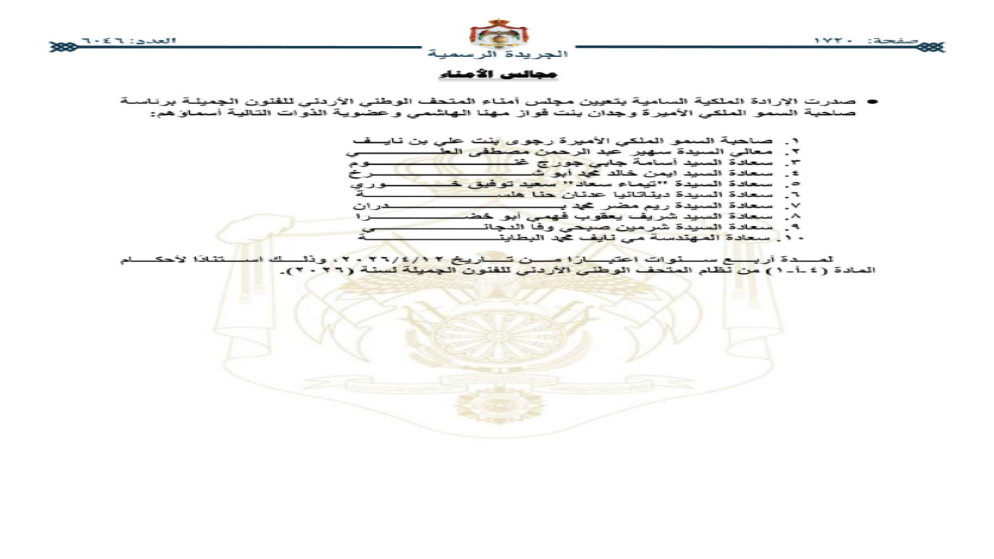 صدرت الإرادة الملكية السامية بتعيين مجلس أمناء المتحف الوطني الأردني للفنون الجميلة برئاسة صاحبة السمو الملكي الأميرة وجدان بنت فواز مهنا الهاشمي، وفقا للجريدة الرسمية في عددها الصادر الخميس.