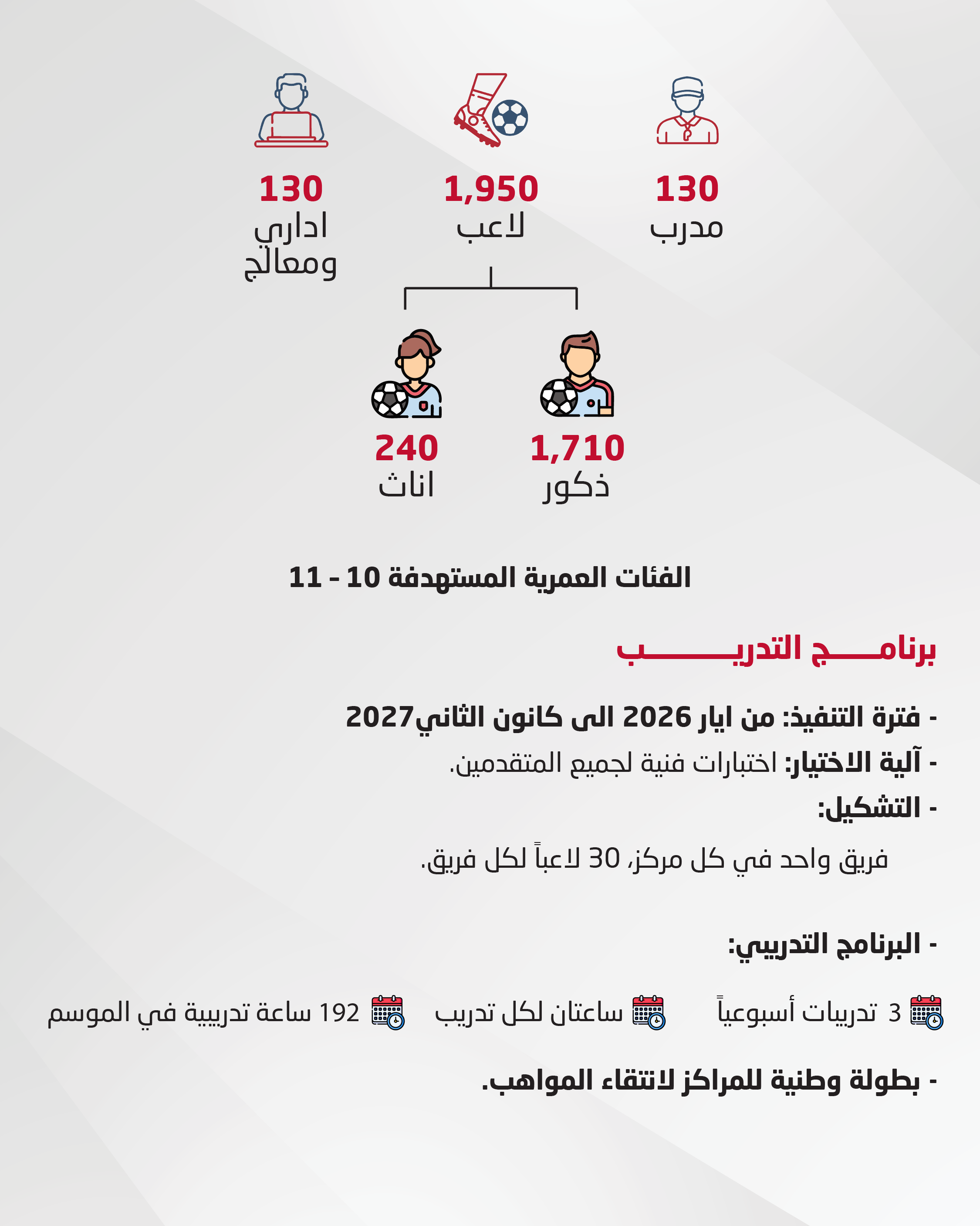 ويستهدف المشروع، الذي سيُعاد إطلاقه تدريجياً، الفئة العمرية لمواليد 2015 و2016، مع خطط لزيادة عدد الفرق والفئات العمرية مستقبلا لتصل إلى ثلاث فئات في كل مركز، حيث يضم كل مركز 30 لاعباً أو لاعبة يتم اختيارهم من خلال تجارب أداء مفتوحة، لاكتشاف أفضل المواهب.