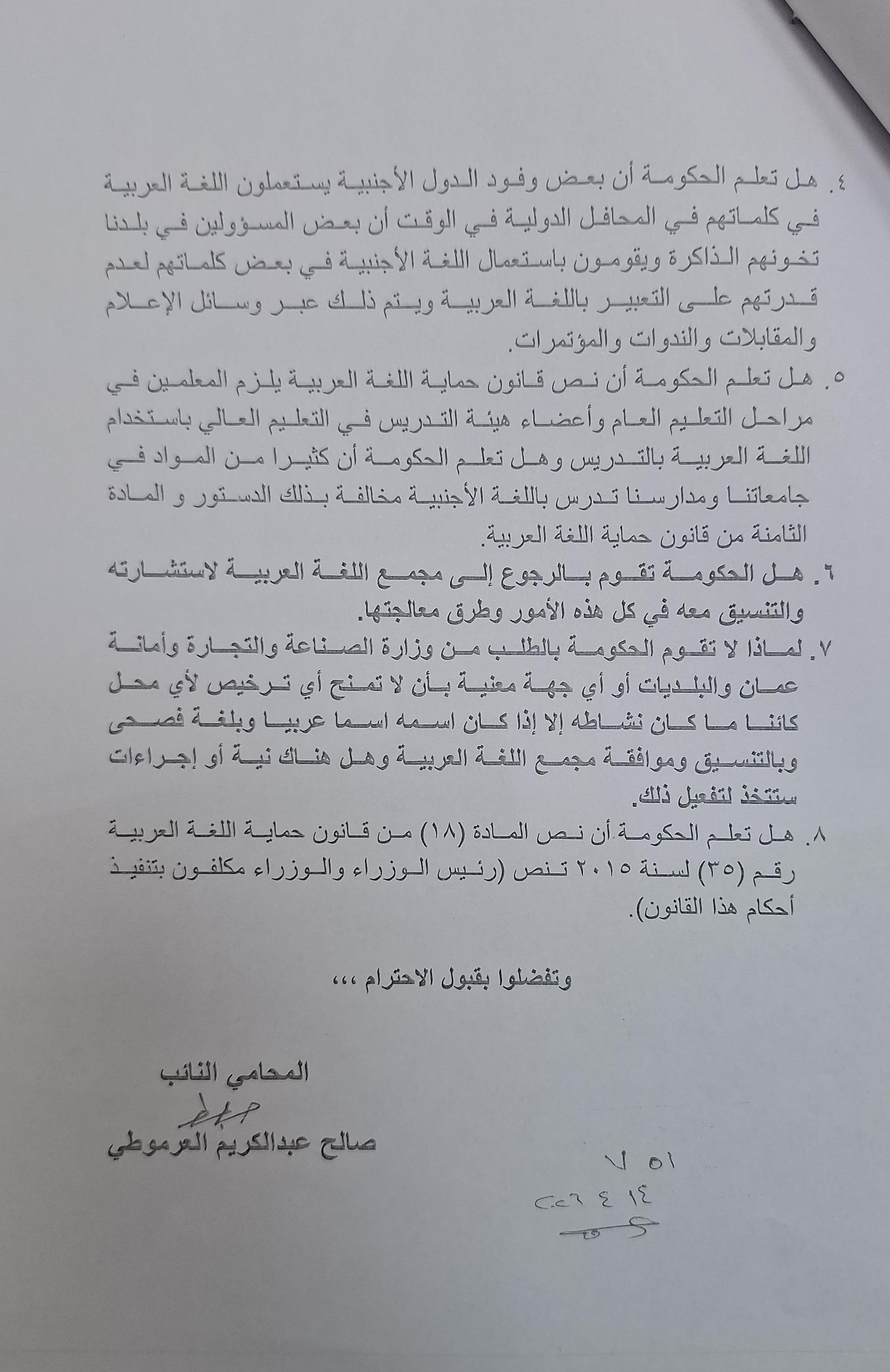وختم العرموطي سؤاله بالتذكير بأن المادة (18) من قانون حماية اللغة العربية رقم (35) لسنة 2015 تُحمّل رئيس الوزراء والوزراء مسؤولية تنفيذ أحكام القانون، ما يضع الحكومة أمام مسؤوليات دستورية وقانونية تستوجب التطبيق الفوري، لا الاكتفاء بالنصوص.