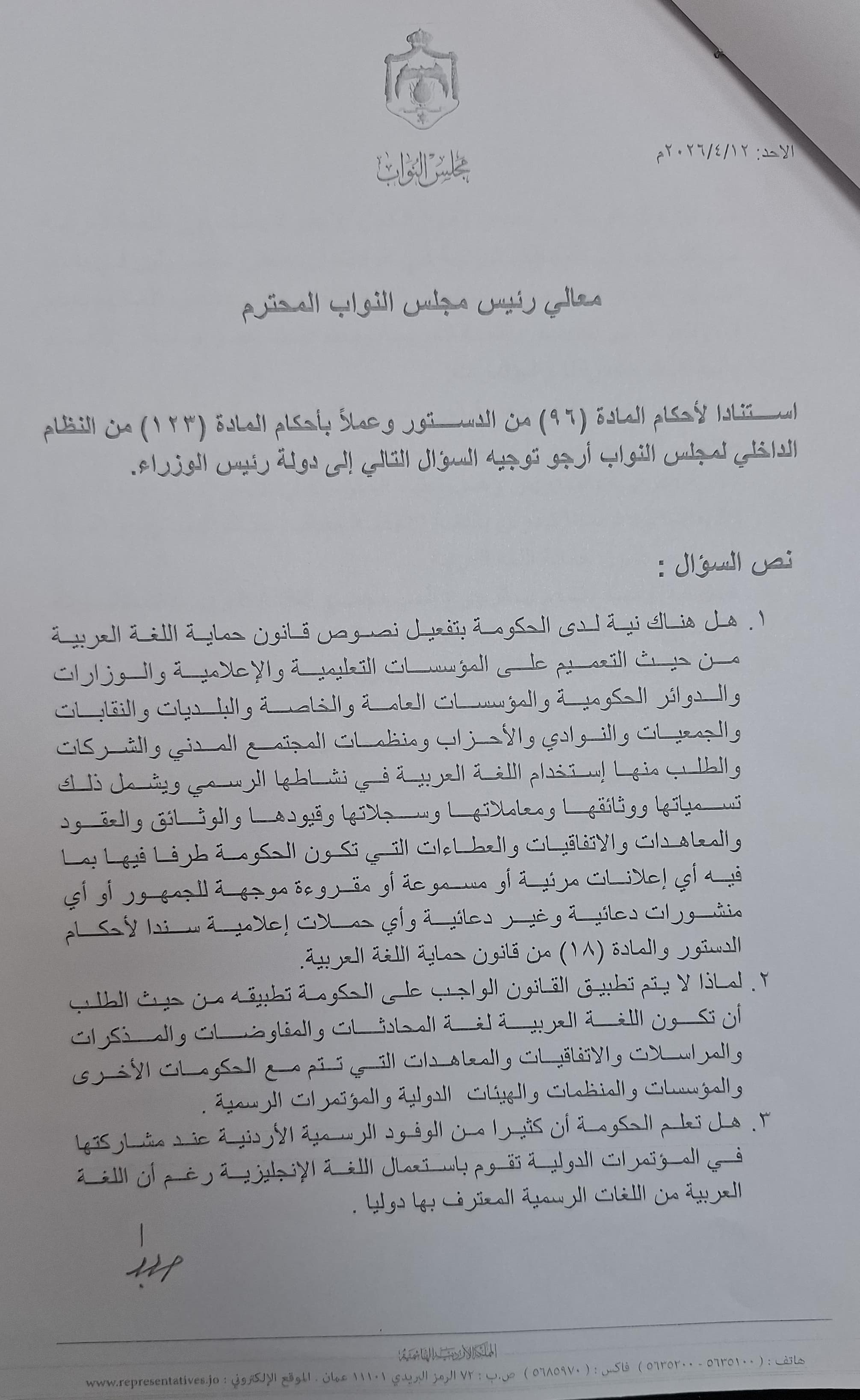 وطالب الحكومة بتوضيح أسباب عدم الالتزام باستخدام اللغة العربية في المراسلات الرسمية، والمفاوضات، والاتفاقيات الدولية، رغم أن القانون يلزم بذلك بشكل صريح، مشيراً إلى أن بعض الوفود الرسمية الأردنية تلجأ إلى استخدام اللغة الإنجليزية في المحافل الدولية، في الوقت الذي تعتمد فيه دول أخرى اللغة العربية في خطاباتها الرسمية.