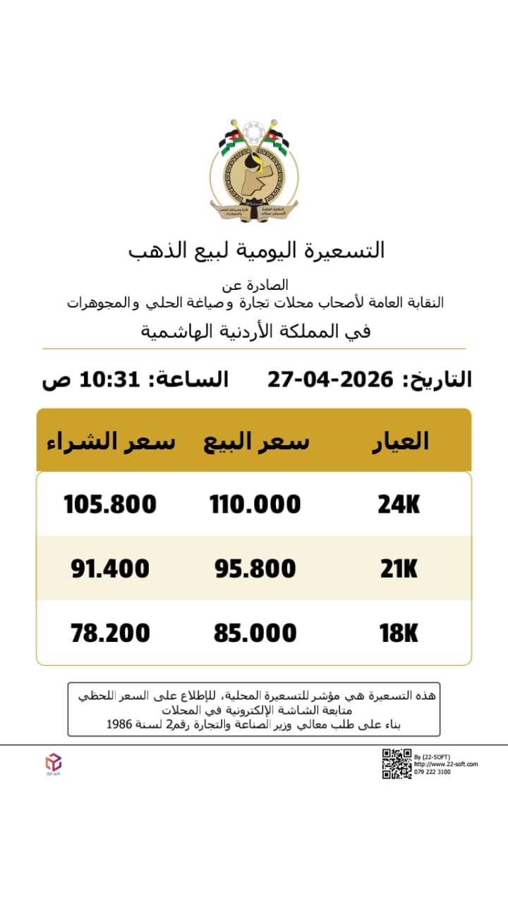 اظهرت التسعيرة اليومية لبيع الذهب في الاردن لهذا اليوم، الصادرة عن النقابة العامة لاصحاب محلات تجارة وصياغة الحلي والمجوهرات اسعار عيارات الذهب الاربعة المتداولة في السوق الاردني.