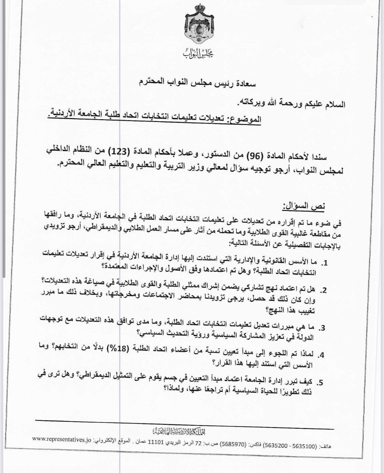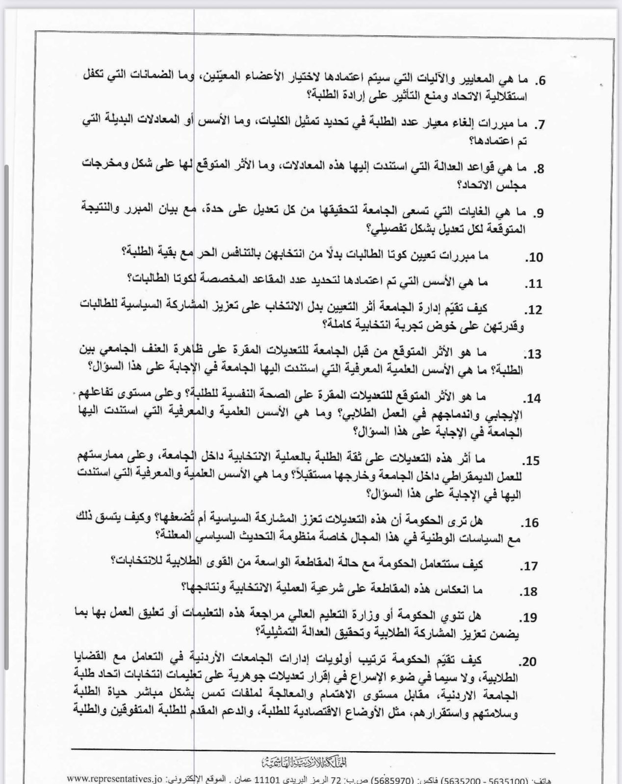 20. كيف تقيّم الحكومة ترتيب أولويات إدارات الجامعات الأردنية في التعامل مع القضايا الطلابية، ولا سيما في ضوء الإسراع في إقرار تعديلات جوهرية على تعليمات انتخابات اتحاد طلبة الجامعة الاردنية، مقابل مستوى الاهتمام والمعالجة لملفات تمس بشكل مباشر حياة الطلبة وسلامتهم واستقرارهم، مثل الأوضاع الاقتصادية للطلبة، والدعم المقدم للطلبة المتفوقين والطلبة غير المقتدرين، والتحديات السلوكية داخل الحرم الجامعي؟ وهل يعكس هذا النهج توازنًا حقيقيًا في السياسات، أم تركيزًا على تنظيم العمل الطلابي على حساب قضايا أكثر إلحاحًا للشارع الطلابي ؟