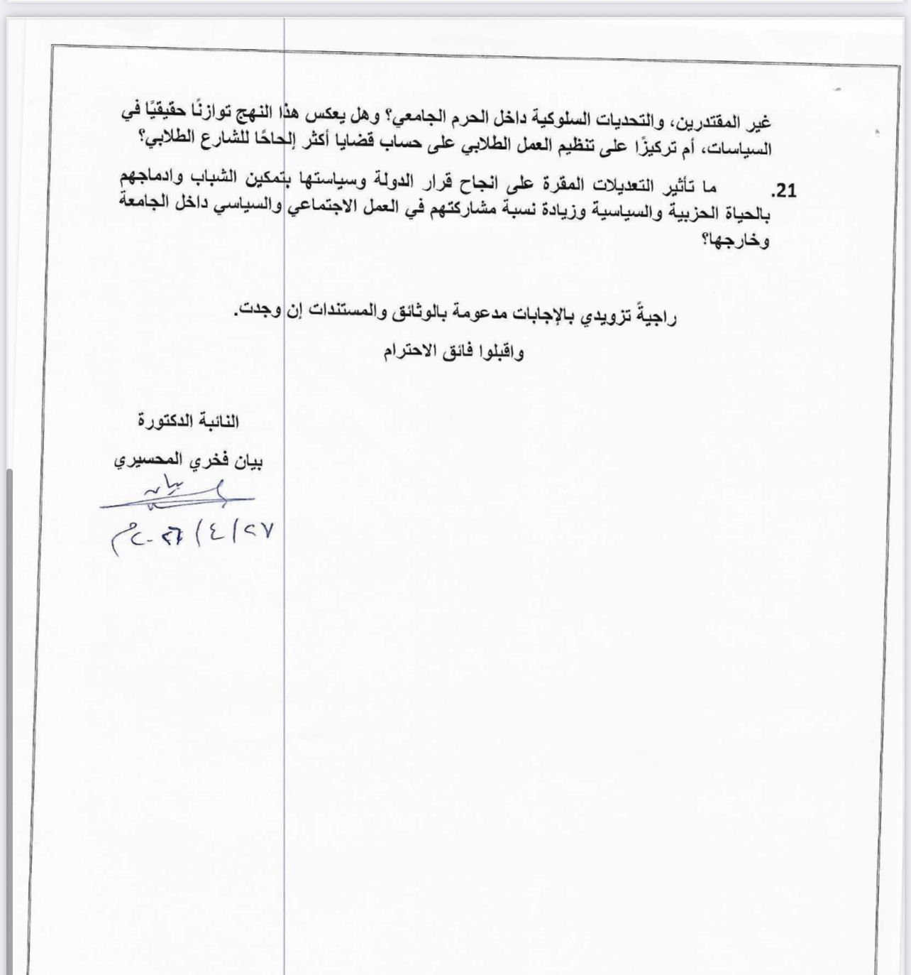 19. هل تنوي الحكومة أو وزارة التعليم العالي مراجعة هذه التعليمات أو تعليق العمل بها بما يضمن تعزيز المشاركة الطلابية وتحقيق العدالة التمثيلية؟