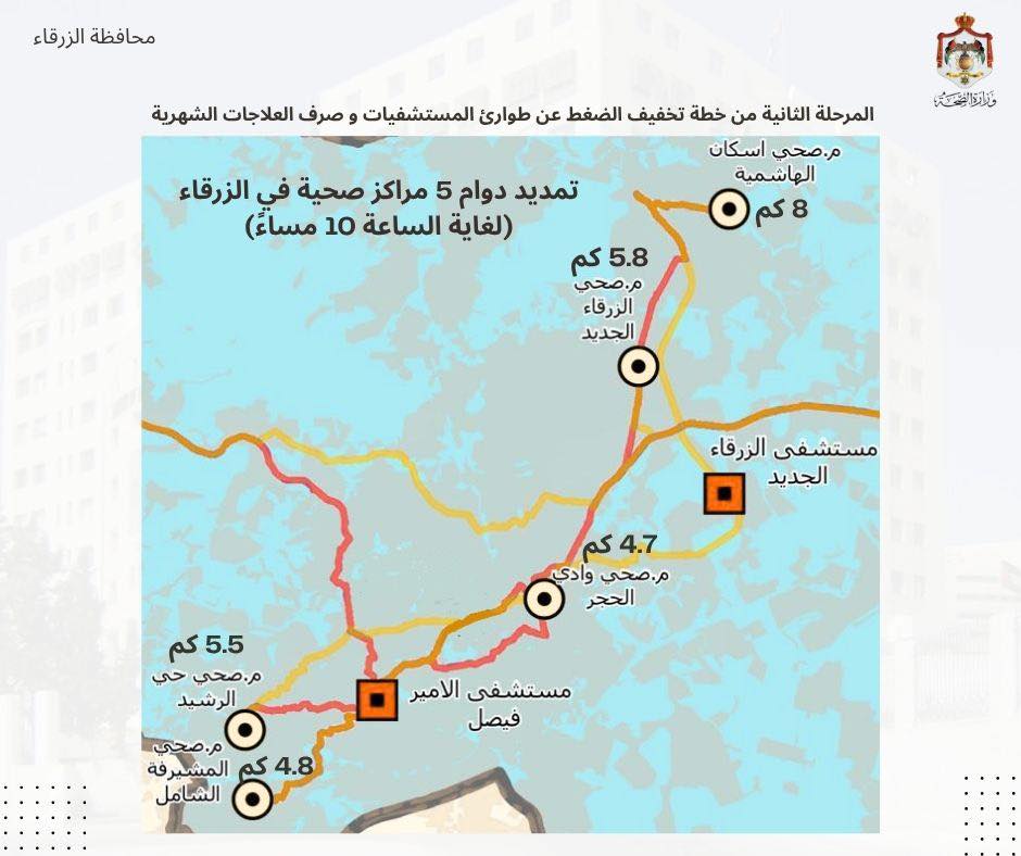 وتشمل المراكز: مركز صحي الزرقاء الشامل، مركز صحي إسكان الهاشمية الشامل ، مركز صحي وادي الحجر الشامل ، مركز صحي المشيرفة الشامل ، ومركز صحي حي الرشيد الشامل، حيث ستبدأ باستقبال المرضى لفترة مسائية من الساعة الرابعة عصرا وحتى الساعة العاشرة مساءً.