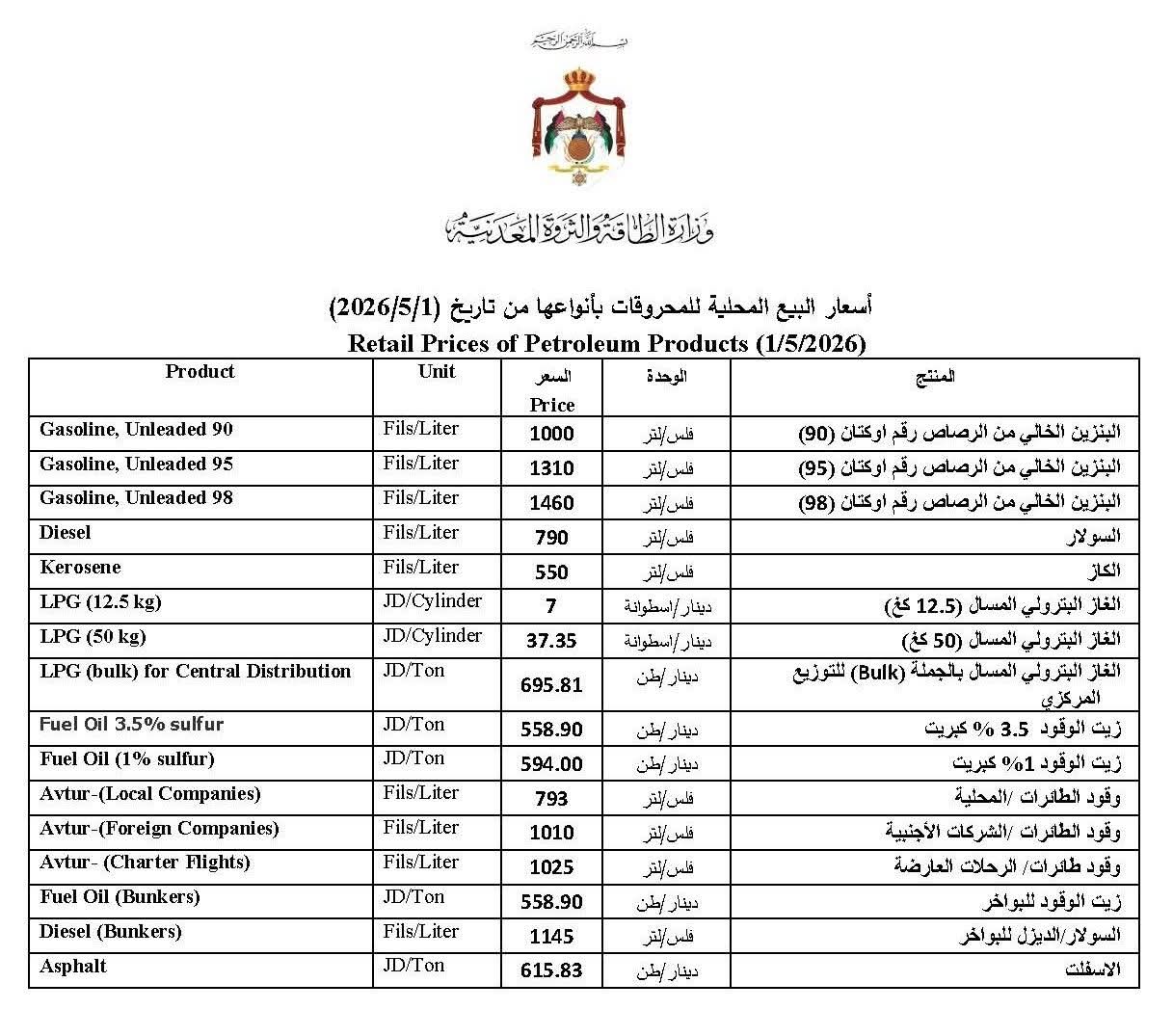 أسعار البيع المحلية للمحروقات بأنواعها من تاريخ 1-5-2026