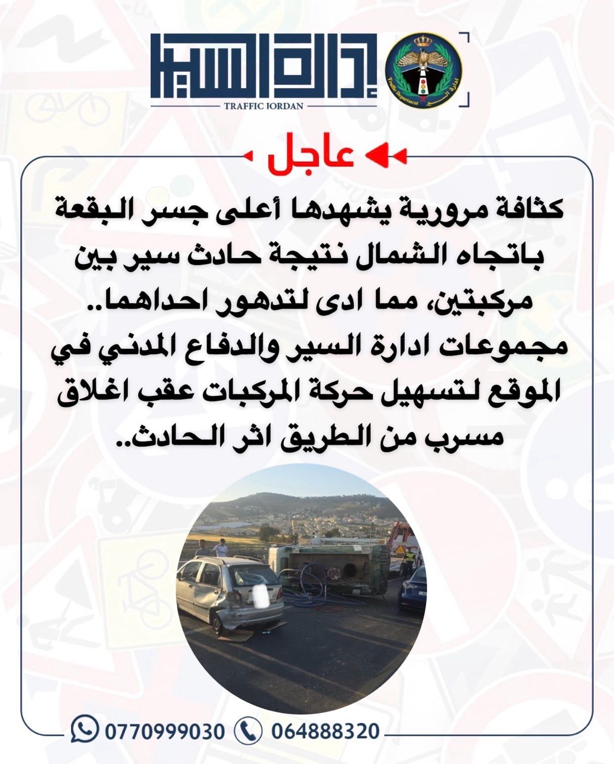 اعلنت ادارة السير انه وقع حادث سير بين مركبتين بأعلى جسر البقعة باتجاه الشمال مما ادى لتدهور احدهما .
