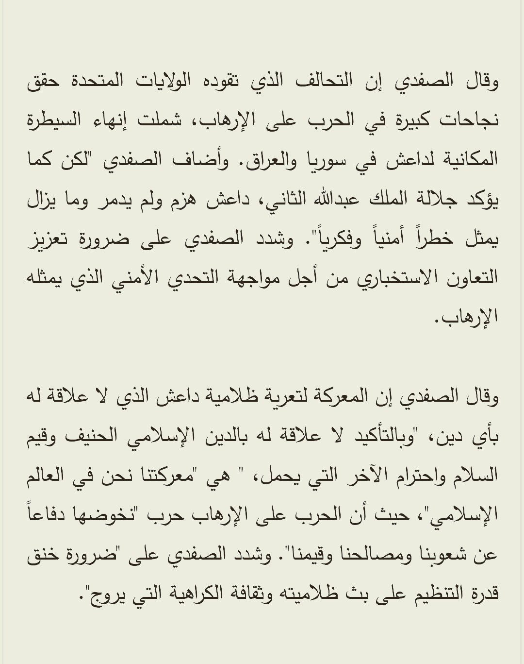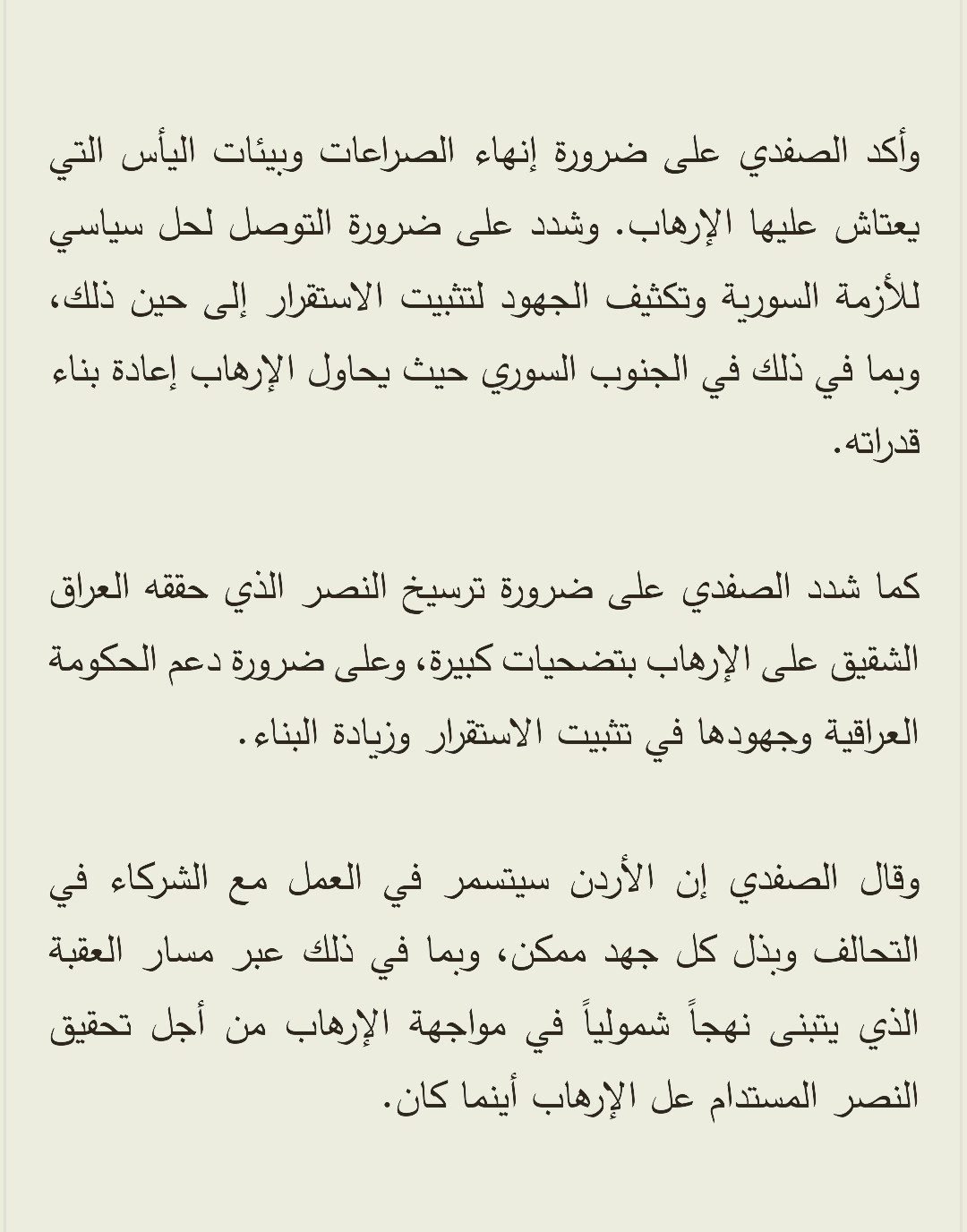 وأضاف الصفدي أنه “كما يؤكد جلالة الملك عبدالله الثاني، داعش هزم ولم يدمر وما يزال يمثل خطراً أمنياً وفكرياً”.