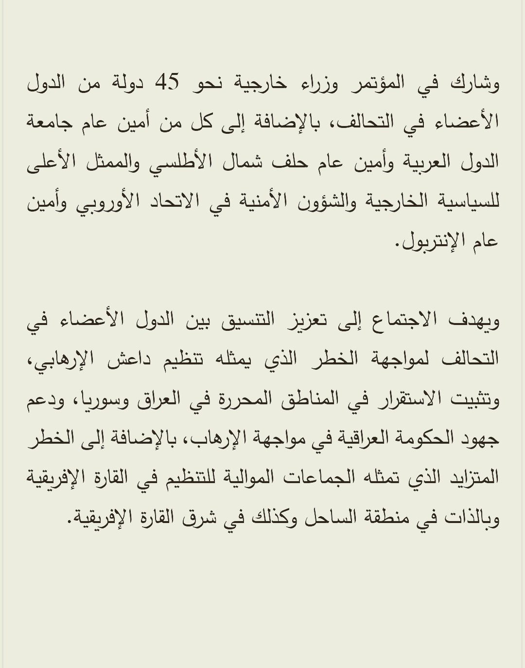 ويأتي ذلك في الاجتماع الوزاري الموسع للتحالف الدولي للقضاء على تنظيم داعش الإرهابي الذي عقد اليوم في العاصمة الإيطالية روما.