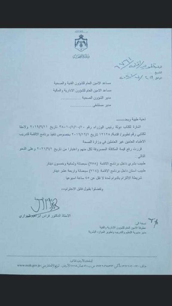 جاء ذلك بعد كتاب وزير الصحة برفع قيمة مكافأة الأطباء العاملين المتدربين في برنامج الإقامة الغير معينين، كما وطالبوا بإزالة العقد المترتب عليهم بعد إنهاء برنامج الإقامة بالعمل في ملاك وزارة الصحة سنتين خدمة عن كل سنة إختصاص أو دفع مبلغ ٤٠ ألف دينار للوزارة حيث طالبوا بمساواتهم بالأطباء الغير معينين واللذين لا يربطهم أي عقد إلزامي للخدمة في ملاك الوزارة حيث أن مادة ٦ في الدستور الأردني تضع الجميع كمواطنين أردنين في ميزان واحد وعدالة واحدة وأن الأردنيين جميعا متساوون في الحقوق والواجبات .