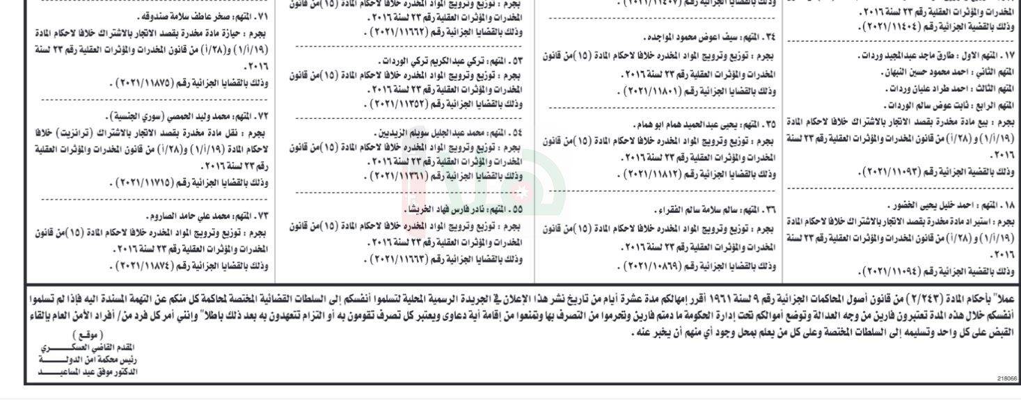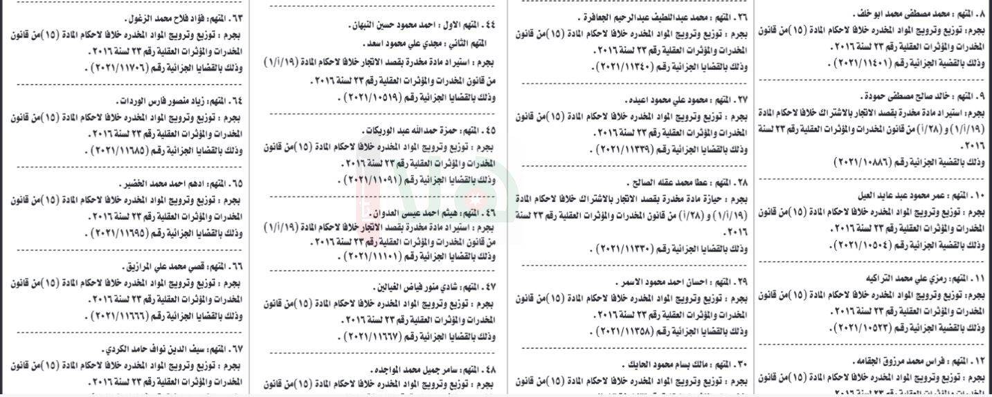 ونشرت المحكمة الخميس، أسماء المتهمين، عملا بأحكام المادة 243 /2 من قانون أصول المحاكمات الجزائية رقم 9 لسنة 1961.