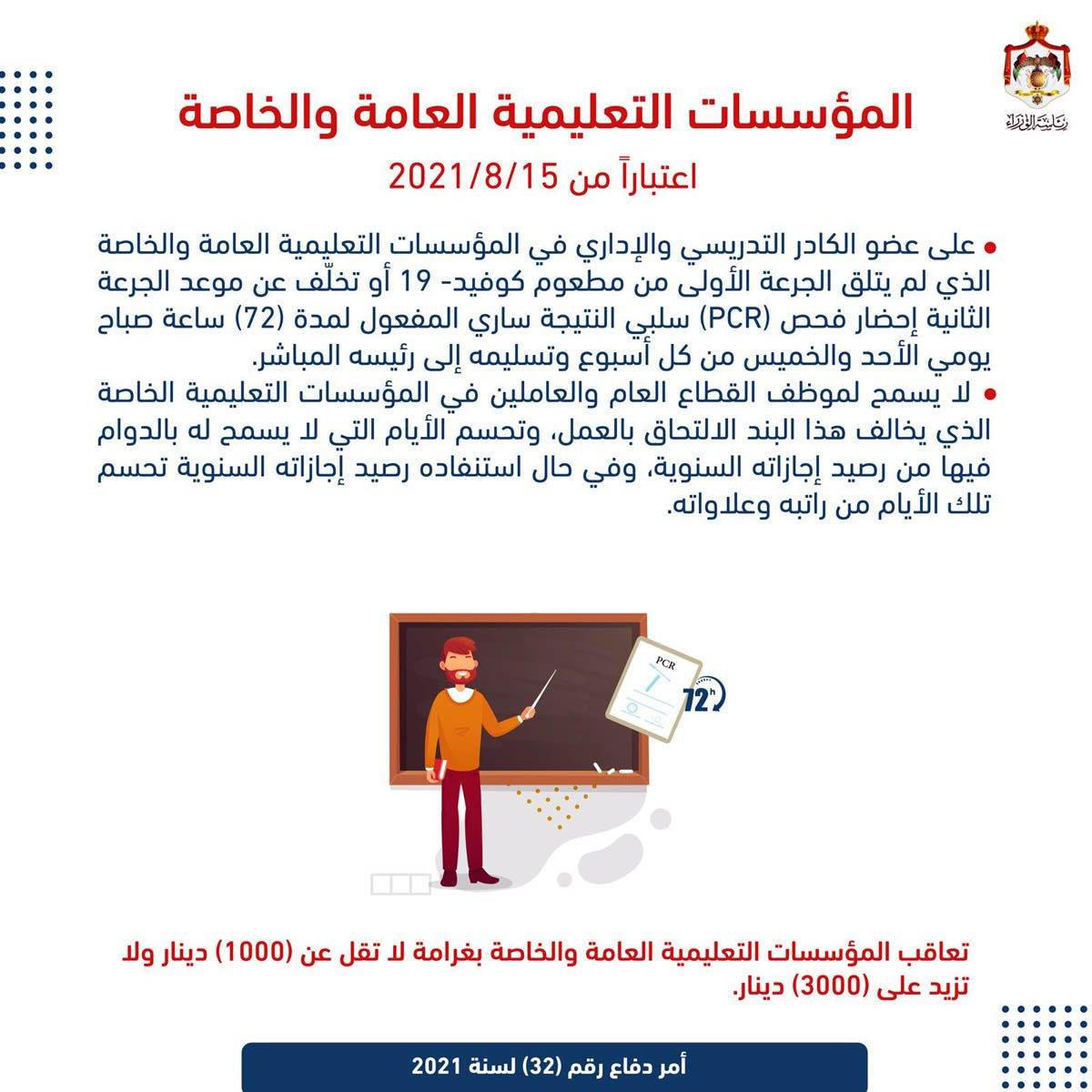 وبحسب أمر الدفاع 32، يتوجب على كل عضو هيئة تدريسية أو إدارية أو طالب في أي من مؤسسات التعليم العالي لم يتلق الجرعة الأولى من المطعوم أو تخلف عن موعد الجرعة الثانية إحضار فحص كورونا (بي سي آر) سلبي النتيجة ساري المفعول لمدة (72) ساعة صباح يومي الأحد والخميس من كل أسبوع ويسلمه إلى رئيسه المباشر، وبالنسبة للطالب يسلمه إلى عميد الكلية أو من يفوضه.