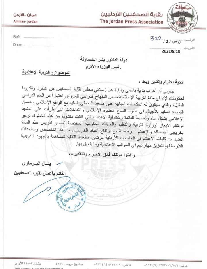 وأكد في كتابه الى الخصاونة، استعداد نقابة الصحفيين المساهمة في الجهود التدريبية اللازمة للخريجين لتعزيز مهاراتهم في الجوانب الاعلامية وما يتعلق بها.