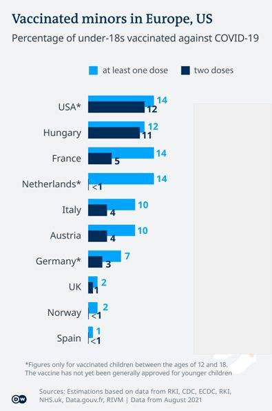 ونوه بأن كندا والولايات المتحدة وافقتا على لقاح فايزر/بيوتنيك للأطفال الذين تتراوح أعمارهم بين 12 و15 عامًا بعد الانتهاء من دراسة أجريت على 2260 فردًا من هذه الفئة العمرية، حيث تم إعطاء 1131 مشاركًا في الدراسة اللقاح، تقول الشركة إن اللقاح أثبت فعاليته بنسبة 100٪ في هذه الفئة العمرية، مما يجعله أكثر فعالية من أي مجموعة أخرى.