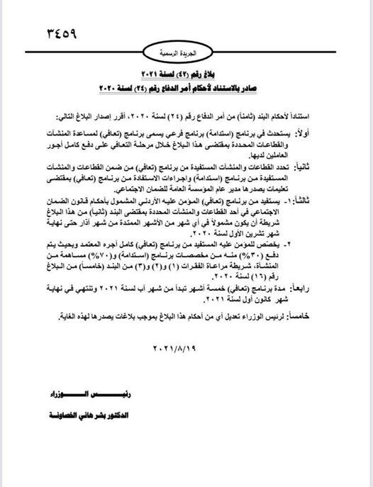 نبأ الأردن - أصدر رئيس الوزراء الدكتور بشر الخصاونة البلاغ رقم (42) لسنة 2021 الذي سيتمّ بموجبه استحداث برنامج فرعي يحمل اسم (تعافي) ضمن برنامج (استدامة) الذي تقدّمه المؤسّسة العامّة للضمان الاجتماعي، وذلك لمساعدة المنشآت والقطاعات المحدّدة بمقتضاه، خلال مرحلة التعافي، على دفع كامل أجور العاملين لديها.