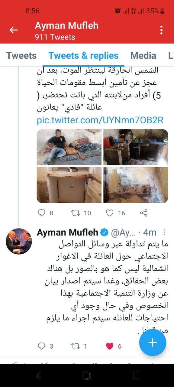 وبحسب تغريدة لوزير التنمية أيمن المفلح، فقد أكد على أن ما يتم تداوله عبر وسائل التواصل الاجتماعي ليس كما هو بالصور المرفقة أدناه بل هناك حقائق سيصدر بيان بها يوم غد الأحد، منوهاً الى أنه في حال وجود احتياجات للعائلة سيتم إجراء ما يلزم.