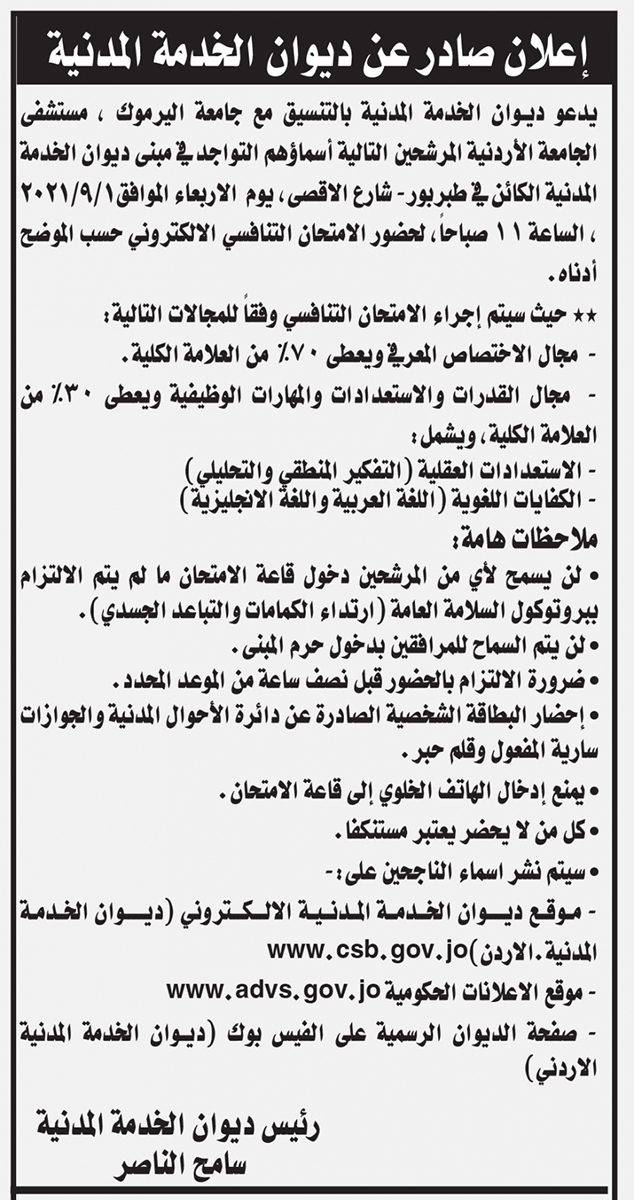 نبأ الأردن- دعا ديوان الخدمة التالية اسمائهم الى التواجد في مبنى الديوان في منطقة طبربور يوم الاربعاء القادم 1/9/2021 لإجراء الامتحان التنافسي ، وفقا للشروط والبيانات التالية: