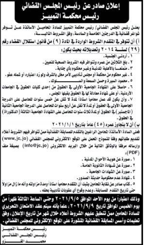 ويشار إلى أنه سيتم عقد امتحان تحريري للمحامين الذين تنطبق عليهم الشروط خلال شهر من تاريخ الإعلان، وفق تعليمات وأسس المسابقة القضائية المنشورة على الموقع الإلكتروني للمجلس القضائي.