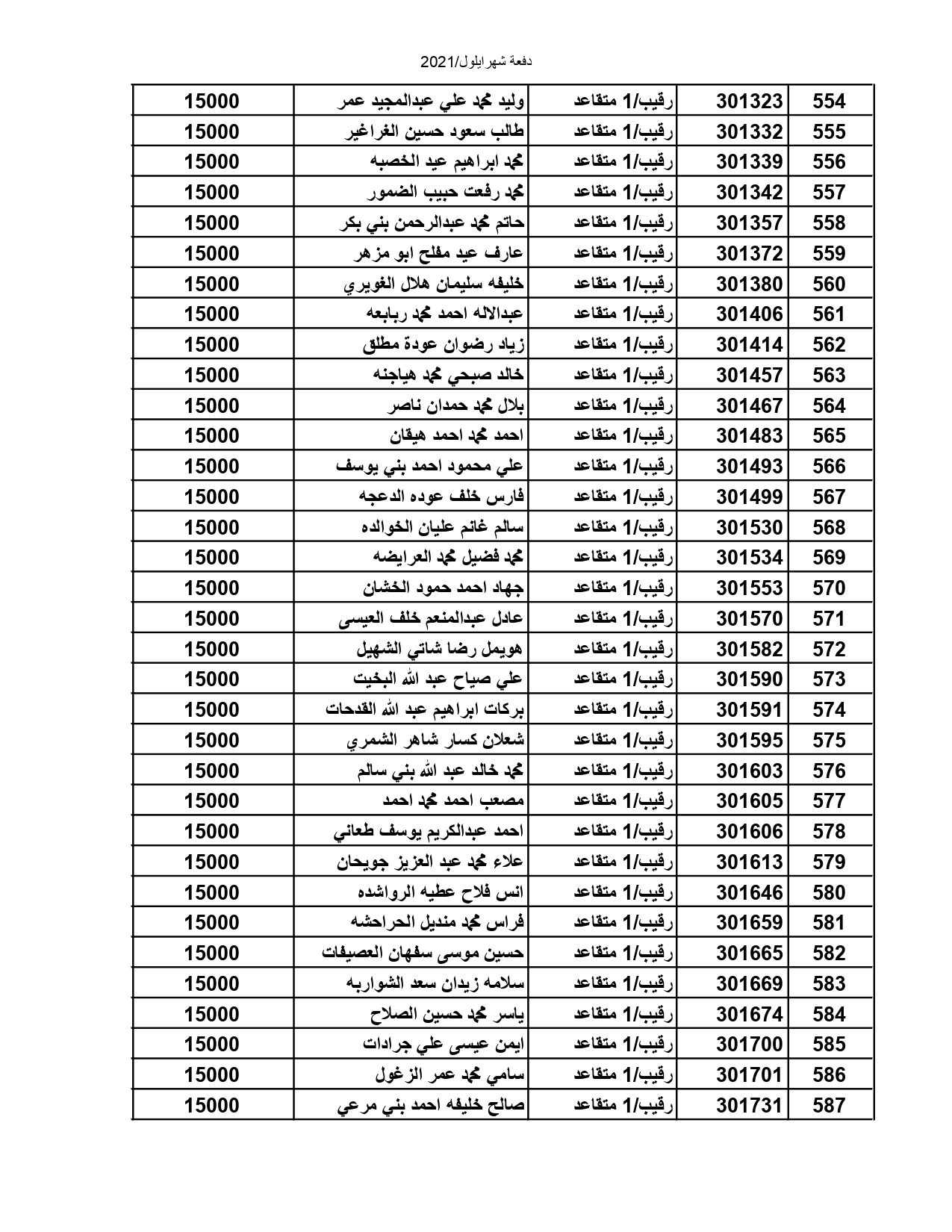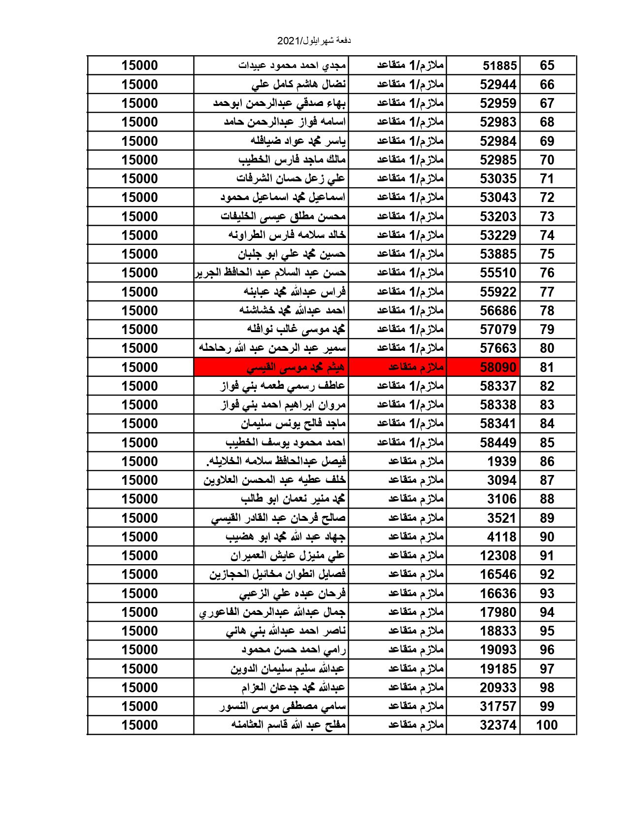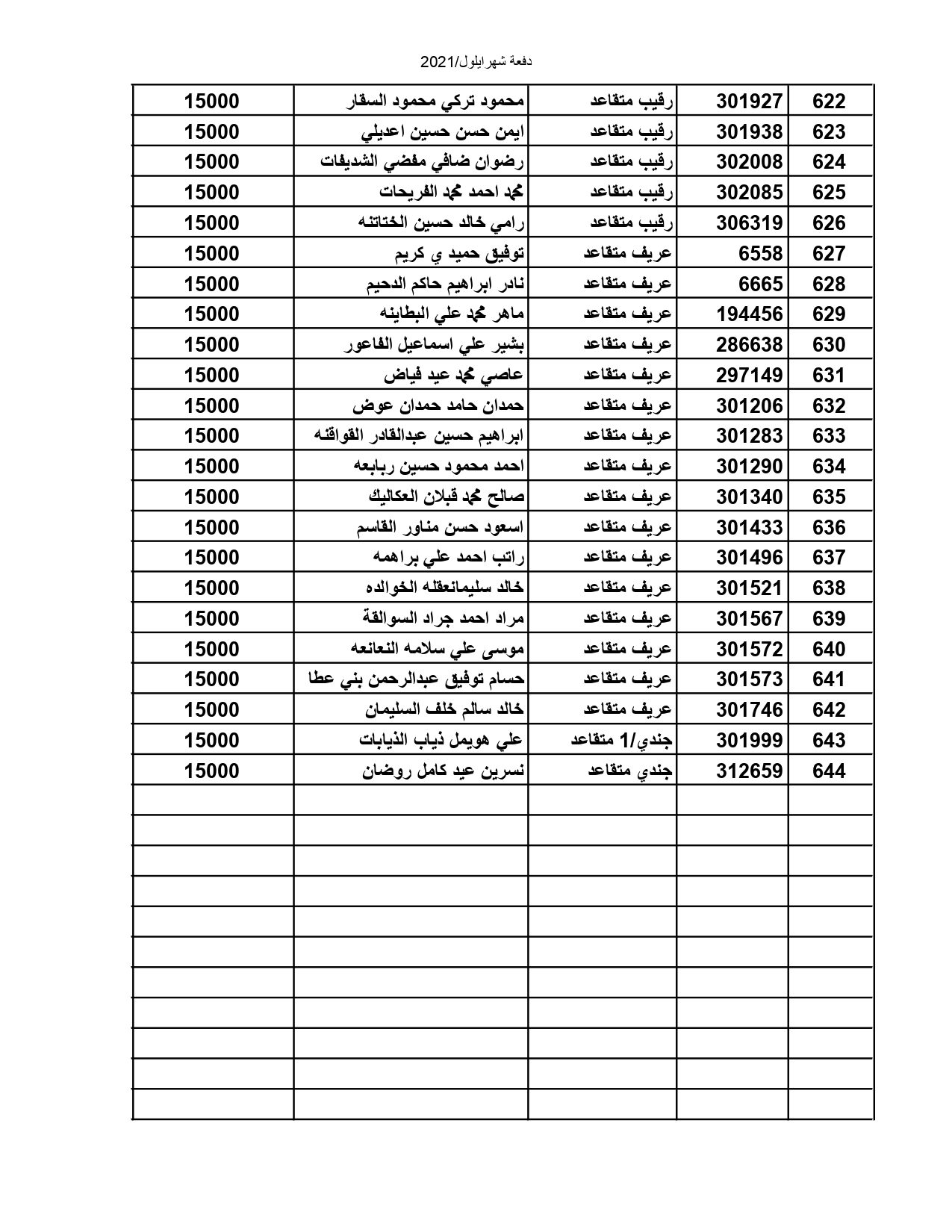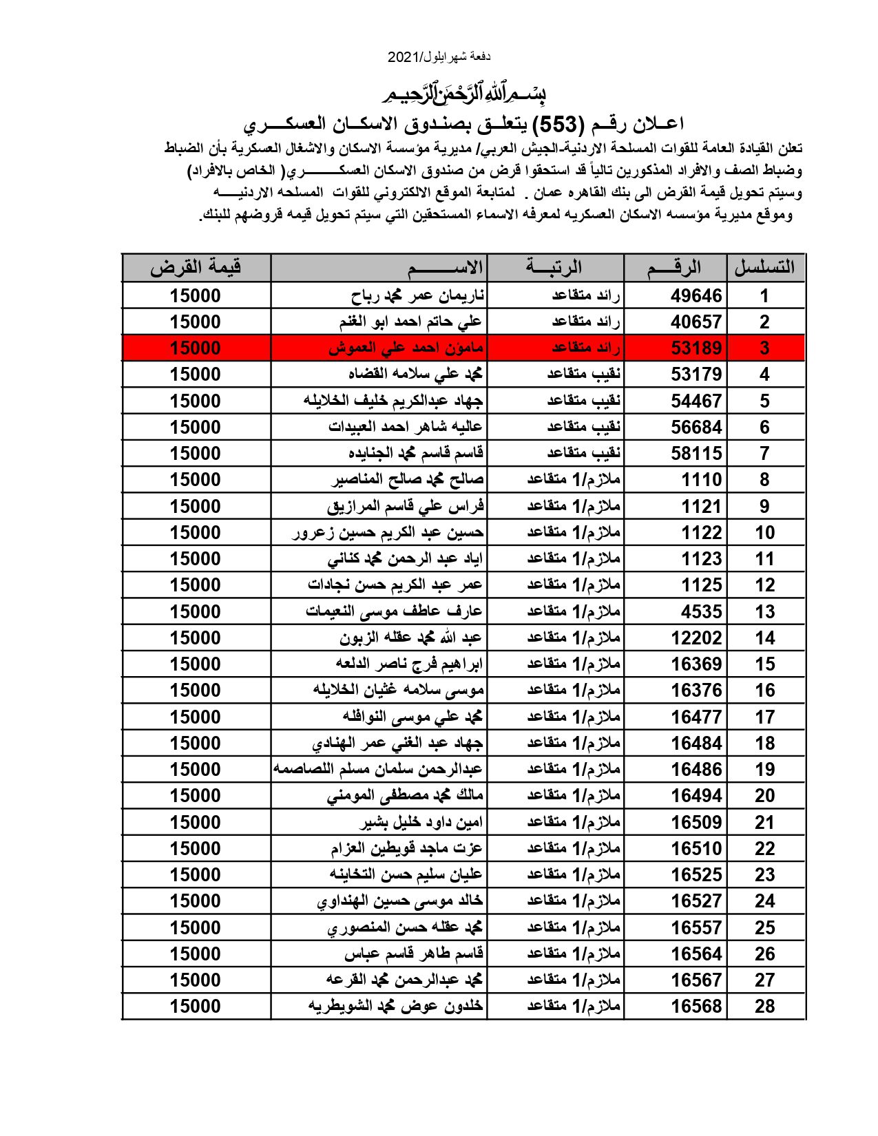 نبأ الأردن- أعلنت القيادة العامة للقوات المسلحة الأردنية – الجيش العربي/ مديرية مؤسسة الإسكان والأشغال العسكرية بأن الضباط وضباط الصف وافراد المبينة أسماءهم أدناه قد استحقوا الحصول على القرض من صناديق الإسكان العسكري.