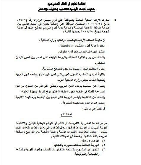 نبأ الأردن- صدرت الإرادة الملكية بالموافقة على اتفاقية التعاون الامني بين الاردن وقطر.