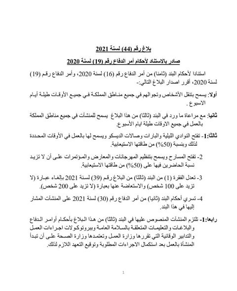 أصدر رئيس الوزراء الدكتور بشر الخصاونة البلاغ رقم (44) لسنة 2021م الذي يسمح بتنقّل الأشخاص وتجوالهم وللمنشآت في جميع مناطق المملكة، بالعمل في جميع الأوقات، وطيلة ايام الأسبوع.