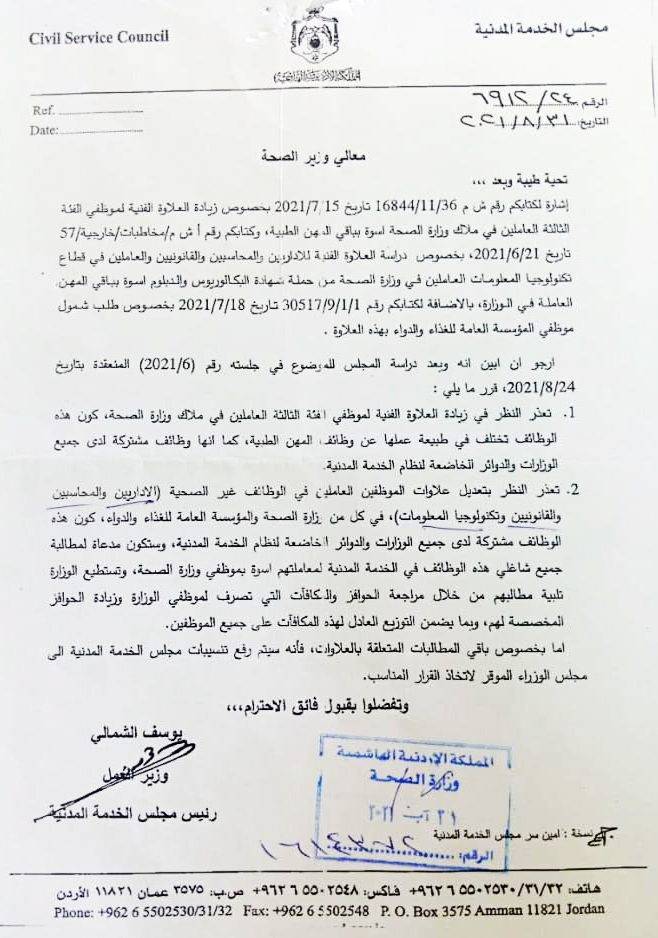 ووفق الكتاب تعذر النظر بتعديل بعلاوات الموظفين العاملين في الوظائف غير الصحية (الإداريين والمحاسبين والقانونيين وتكنولوجيا المعلومات) في كل من وزارة الصحة والمؤسسة العامة للغذاء والدواء كونها مشتركة مع لدى جميع الوزارات والدوائر الخاضعة لنظام الخدمة المدنية، وستكون مدعاة لمطالبة جميع شاغلي هذه الوظائف في الخدمة المدنية لمعاملتهم أسوة بموظفي وزارة الصحة، وتستطيع الوزارة تلبية مطالبهم من خلال مراجعة الحوافز والمكافآت التي تصرف لموظفي الوزارة وزيادة الحوافز المخصصة لهم، وبما يضمن التوزيع العادل لهذه المكافآت على جميع الموظفين.