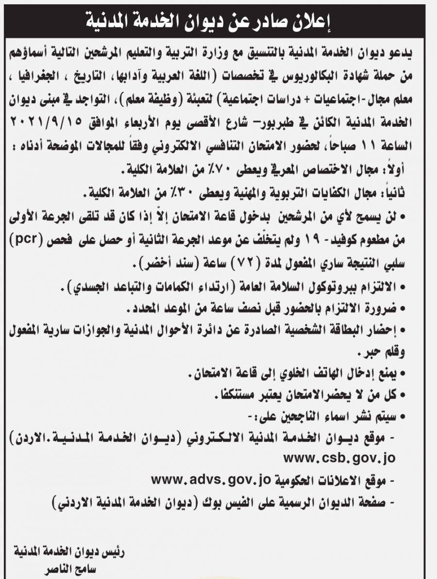 نبأ الأردن- أعلن ديوان الخدمة المدنية عن اسماء المدعوين لحضور الامتحان التنافسي الالكتروني من حملة شهادة البكالوريوس في التخصصات (اللغة العربية وآدابها، تاريخ، جغرافيا، معلم مجال/اجتماعيات+ دراسات اجتماعية) لتعبئة وظيفة معلم بتاريخ 15/9/2021، وفقا للتفاصيل أدناه.