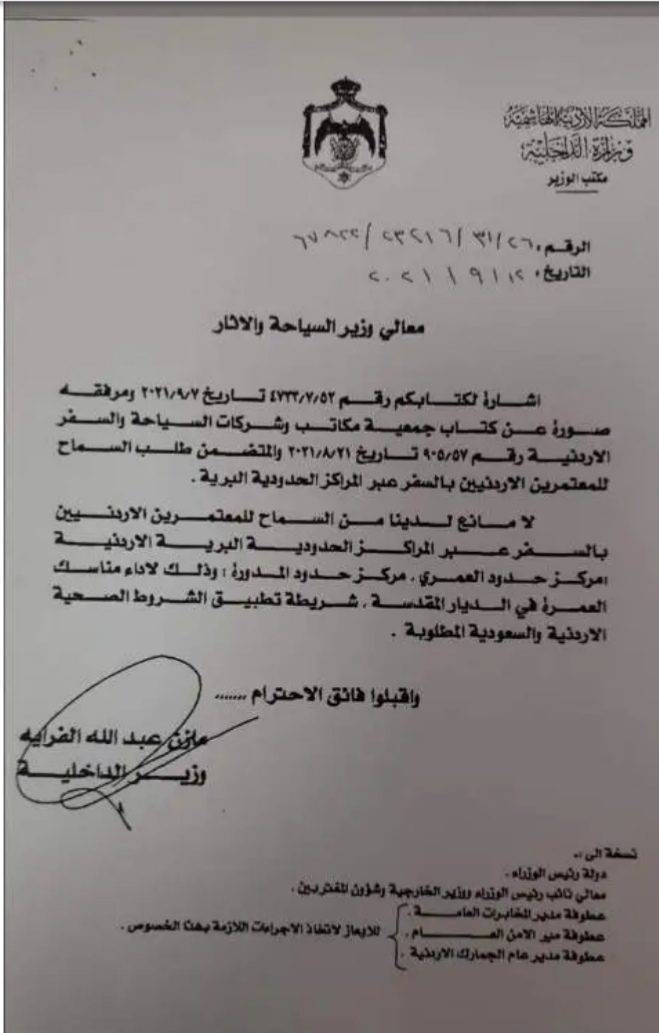 وقال الفراية في كتاب: "لا مانع لدينا من السماح للمعتمرين الأردنيين بالسفر عبر المراكز الحدودية البرية الأردنية (مركز حدود العمري ومركز حدود المدورة)، وذلك لأداء مناسك العمرة في الديار المقدسة، شريطة تطبيق الشروط الصحية الأردنية والسعودية المطلوبة".
