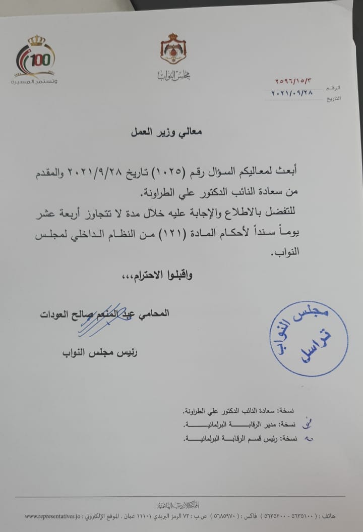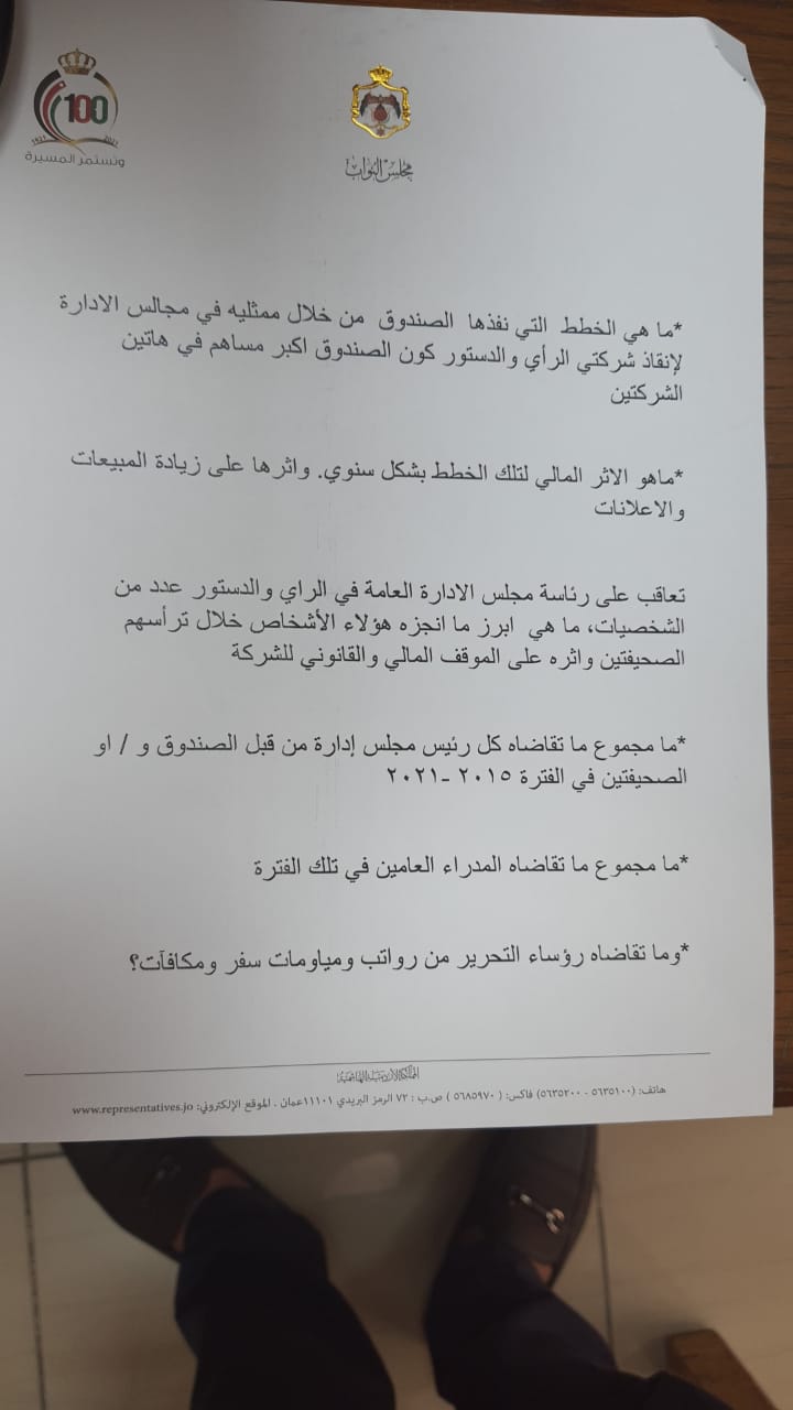 وحسب وثيقة السؤال التي حصل عليها موقع نبأ الإخباري، فقد سأل الطراونة عن حجم ما تقاضاه كل رئيس مجلس إدارة والمدراء العامين في الصحيفتين خلال الفترة من 2015 وحتى 2021، وما تقاضاه كذلك رؤساء التحرير من رواتب ومياومات سفر ومكافآت.