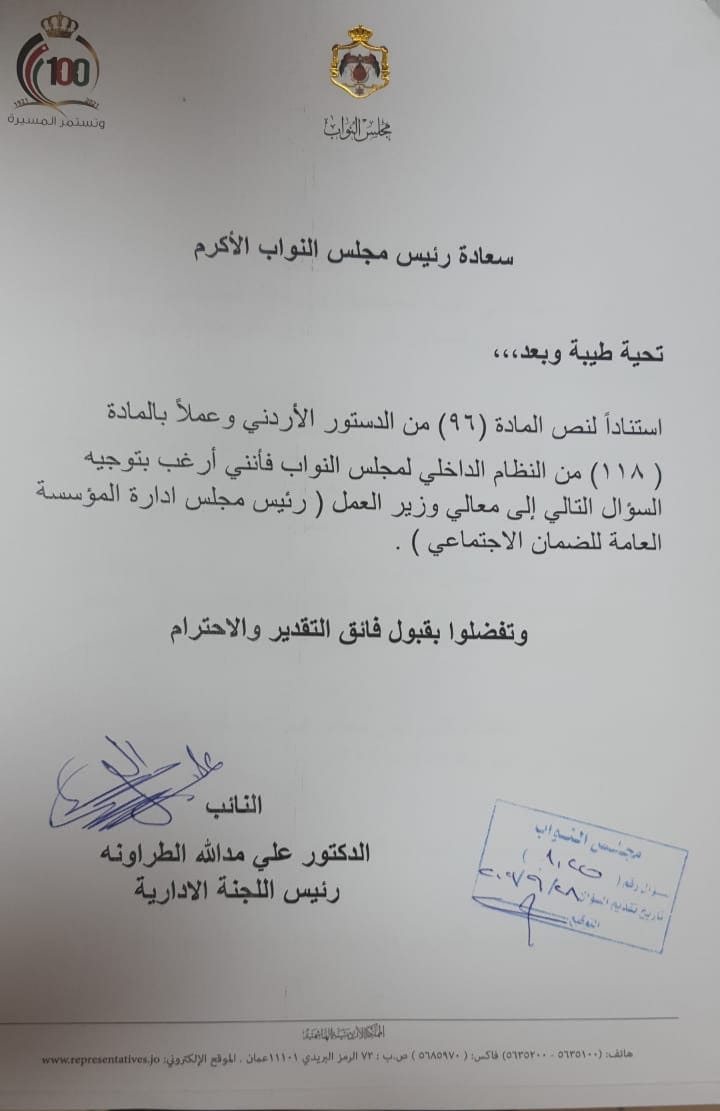 (وثيقة) الطراونة يسأل عن رواتب ومكافآت رؤساء مجالس الإدراة و"التحرير" والمدراء في الرأي والدستور