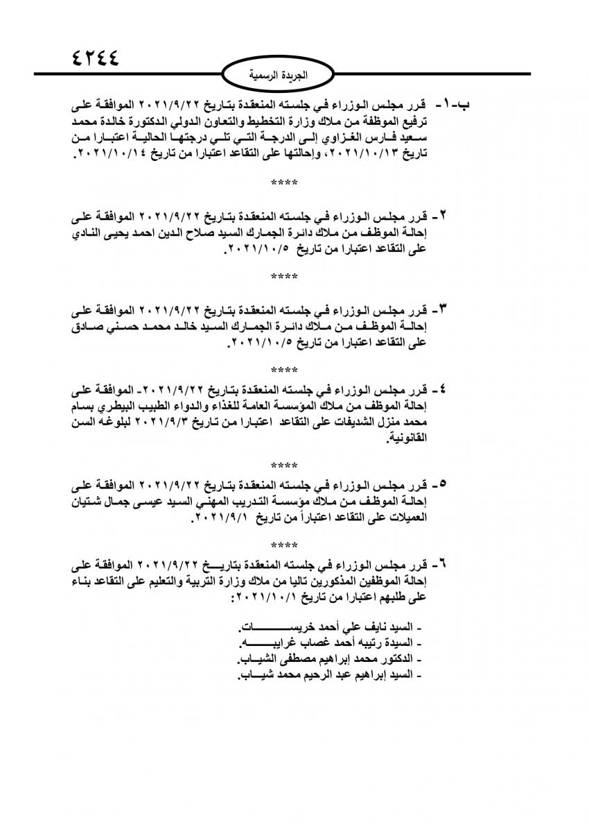 نبأ الأردن- صدر في عدد الجريدة الرسمية الخميس، قرارات مجلس الوزراء باحالة موظفين حكوميين إلى التقاعد، وانهاء خدمات آخرين.