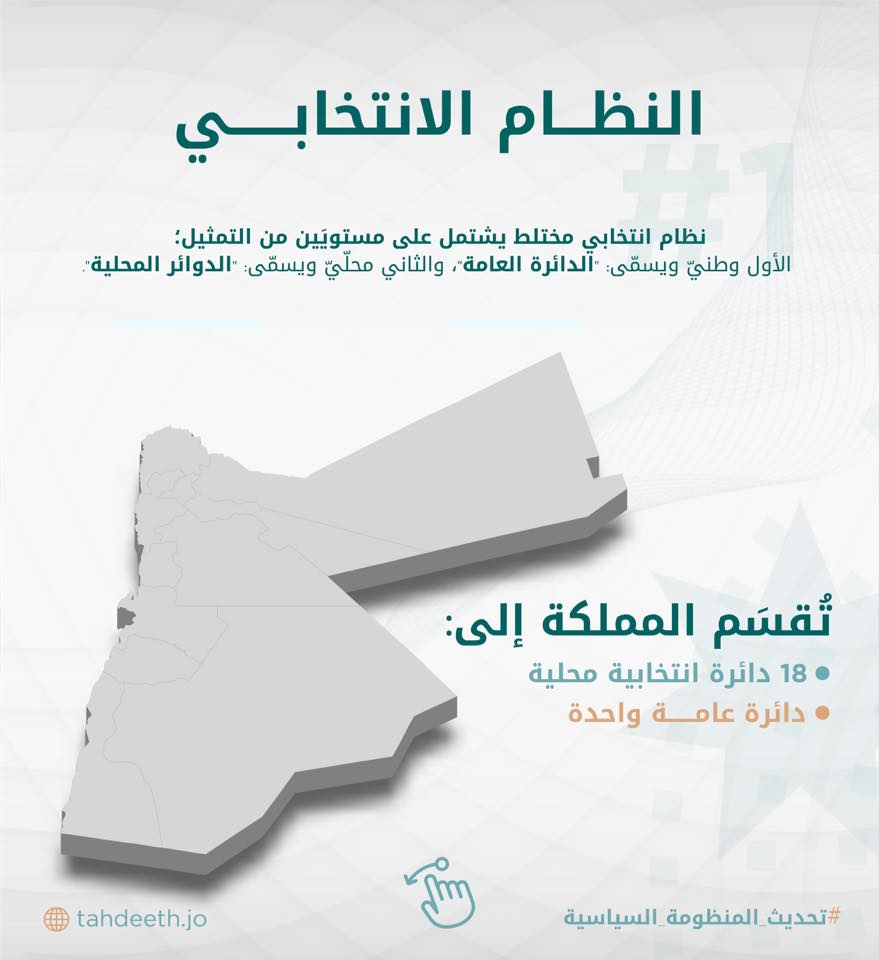 أما بالنسبة للدوائر المحلية، فتشمل ثلاث دوائر لمحافظة العاصمة، ودائرتين لمحافظة إربد، ودائرة انتخابية لكل محافظة من بقية محافظات المملكة، وثلاث دوائر للبدو، إلا أنه يجوز لأبناء وبنات البادية الأردنية الترشح خارج الدوائر المحلية المخصصة لهم، كما يجوز لأي من المترشحين من الدوائر المحلية الأخرى الترشح في دوائر البادية، ويبقى سجل الناخبين لدوائر البادية مغلقا.