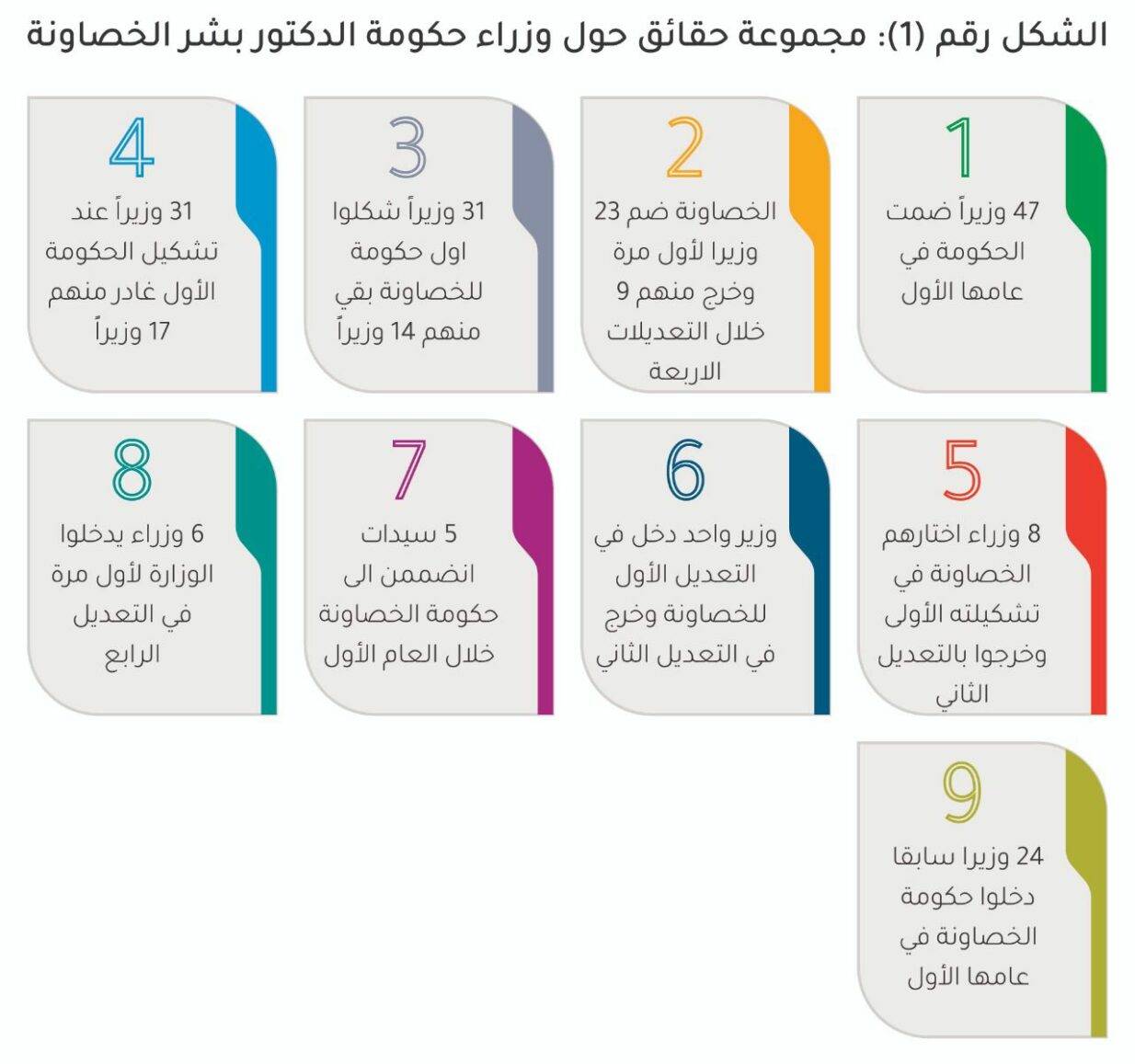 وبين التحليل أن التشكيلة الحالية للحكومة بعد التعديل الرابع ضمت 15 وزيراً سابقاً و13 وزيراً تم توزيرهم في عهد الدكتور بشر الخصاونة، علماً بأن الخصاونة وزّر 23 وزيراً لأول مرة خلال العام الأول من عمر حكومته، فيما كان عدد الوزراء السابقين الذين تم إعادة توزيرهم خلال العام الأول 24 وزيراً.