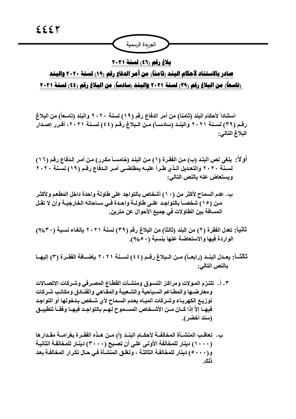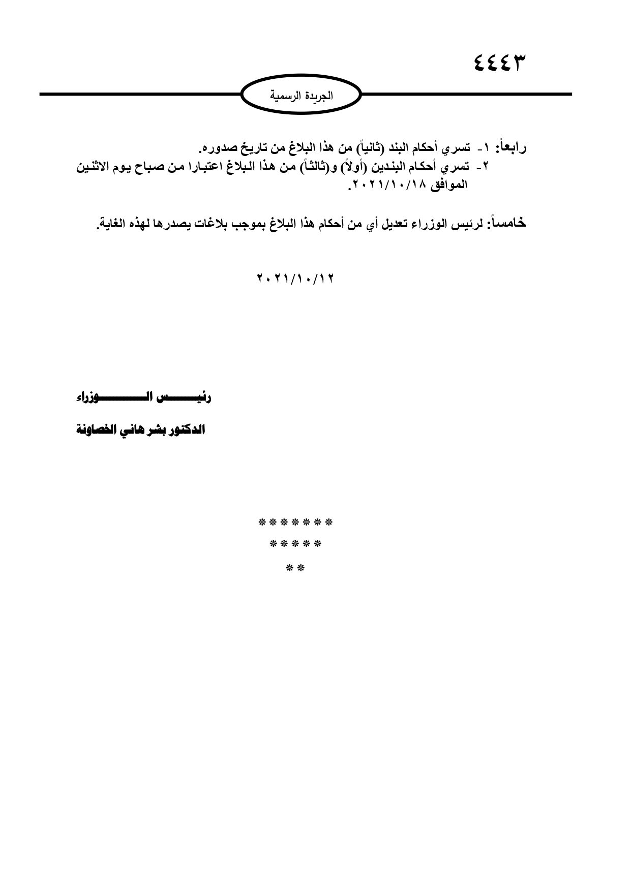 نبأ الاردن-أصدر رئيس الوزراء بشر الخصاونة، بلاغ رقم (46) من أمر الدفاع رقم (19).