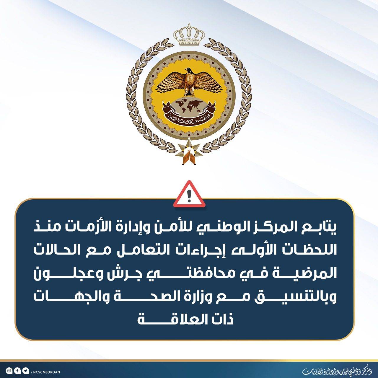 نبأ الأردن- أكد المركز الوطني للأمن وإدارة الأزمات أنه يتابع منذ اللحظات الأولى إجراءات التعامل مع الحالات المرضية في محافظتي جرش وعجلون .وبالتنسيق مع وزارة الصحة والجهات ذات العلاقة.