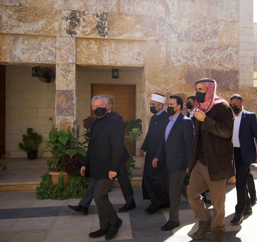 ورافق جلالة الملك، سمو الأمير غازي بن محمد، كبير مستشاري جلالة الملك للشؤون الدينية والثقافية والمبعوث الشخصي لجلالته، ورئيس الديوان الملكي الهاشمي يوسف حسن العيسوي، ووزير الأوقاف والشؤون والمقدسات الإسلامية الدكتور محمد الخلايلة.