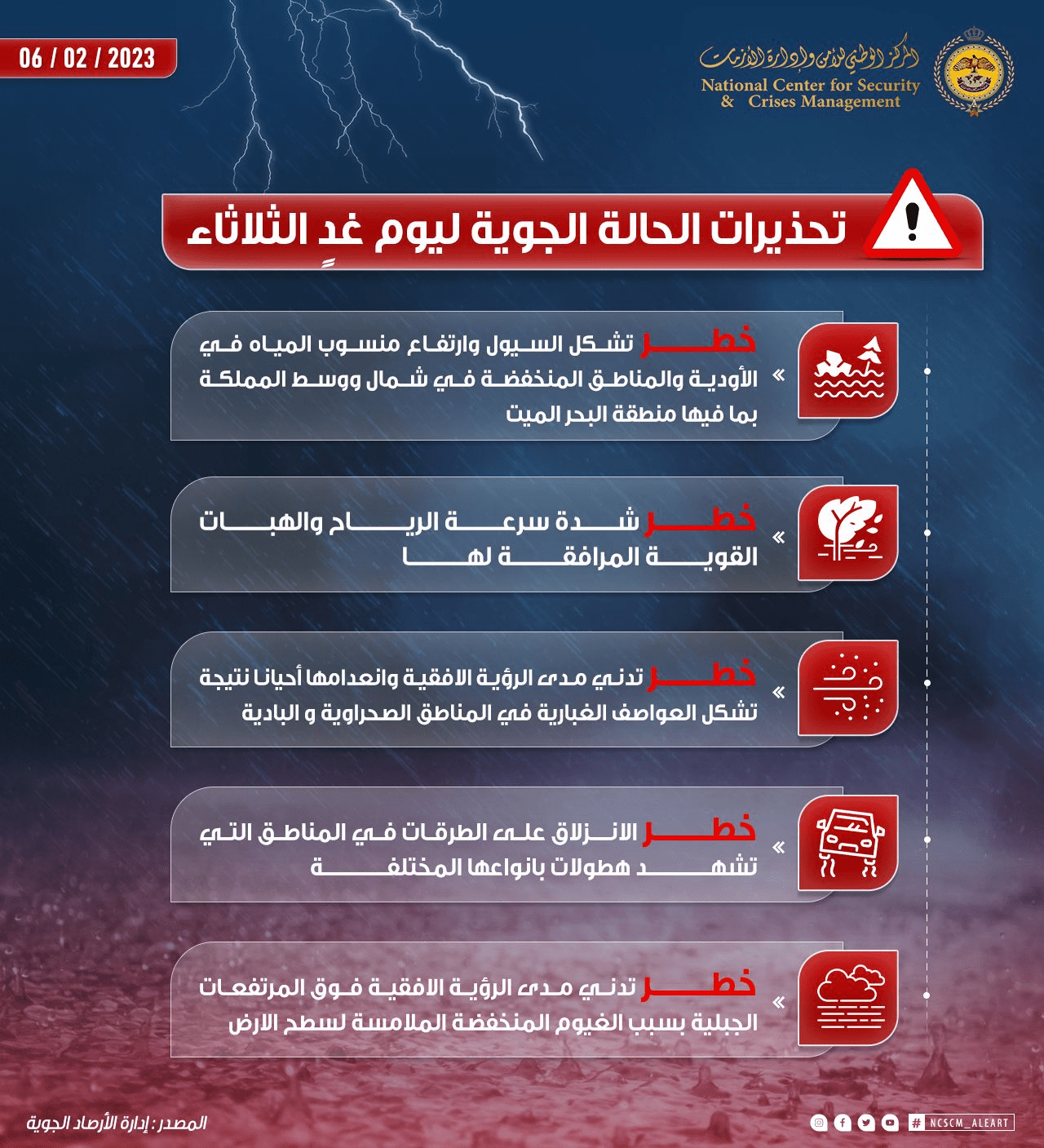 تحذيرات الحالة الجوية ليوم غدٍ الثلاثاء2023-02-06 20:41:51 -