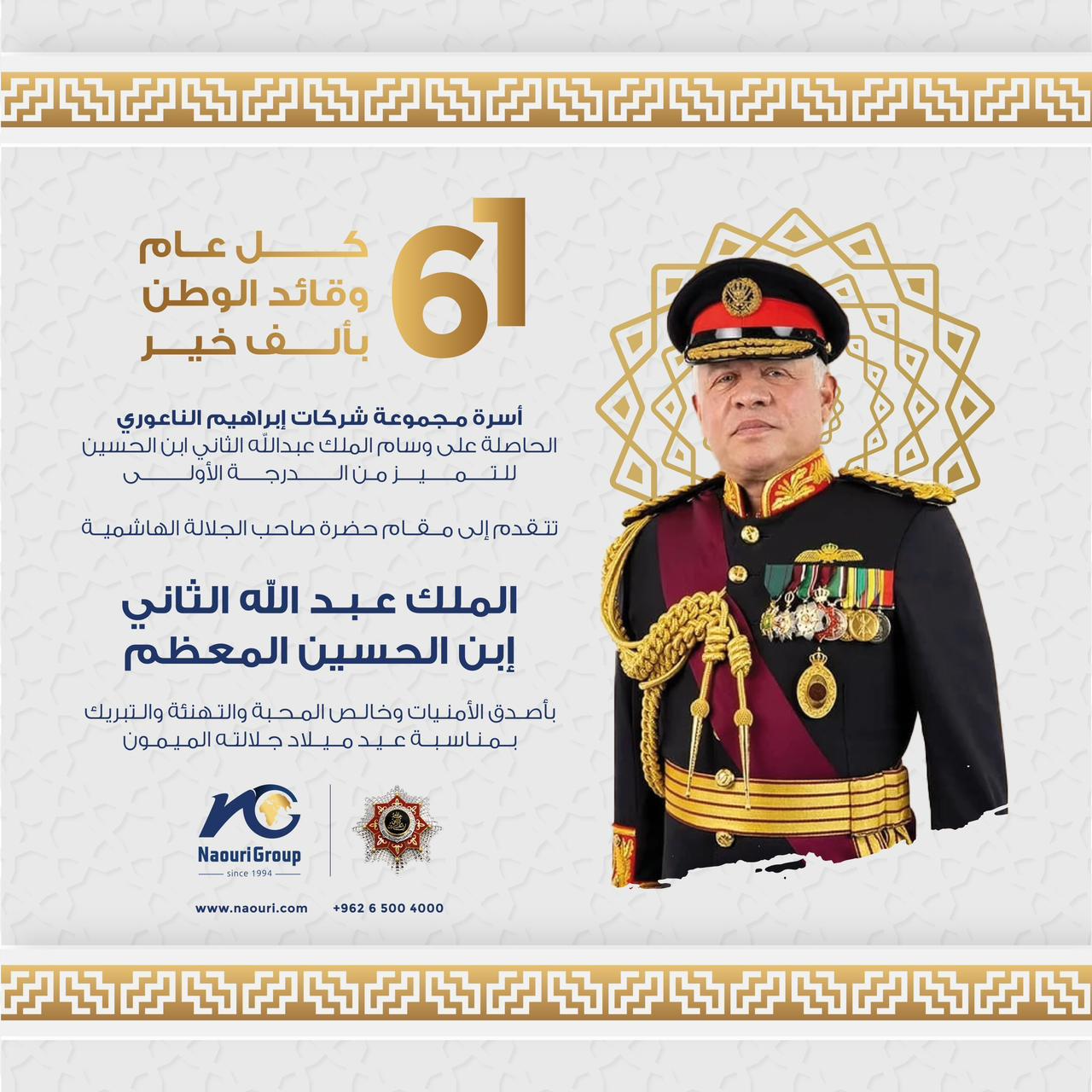 مجموعة الناعوري تهنئ جلالة الملك عبدالله الثاني بعيد ميلاده السعيد2023-01-30 10:00:03 -