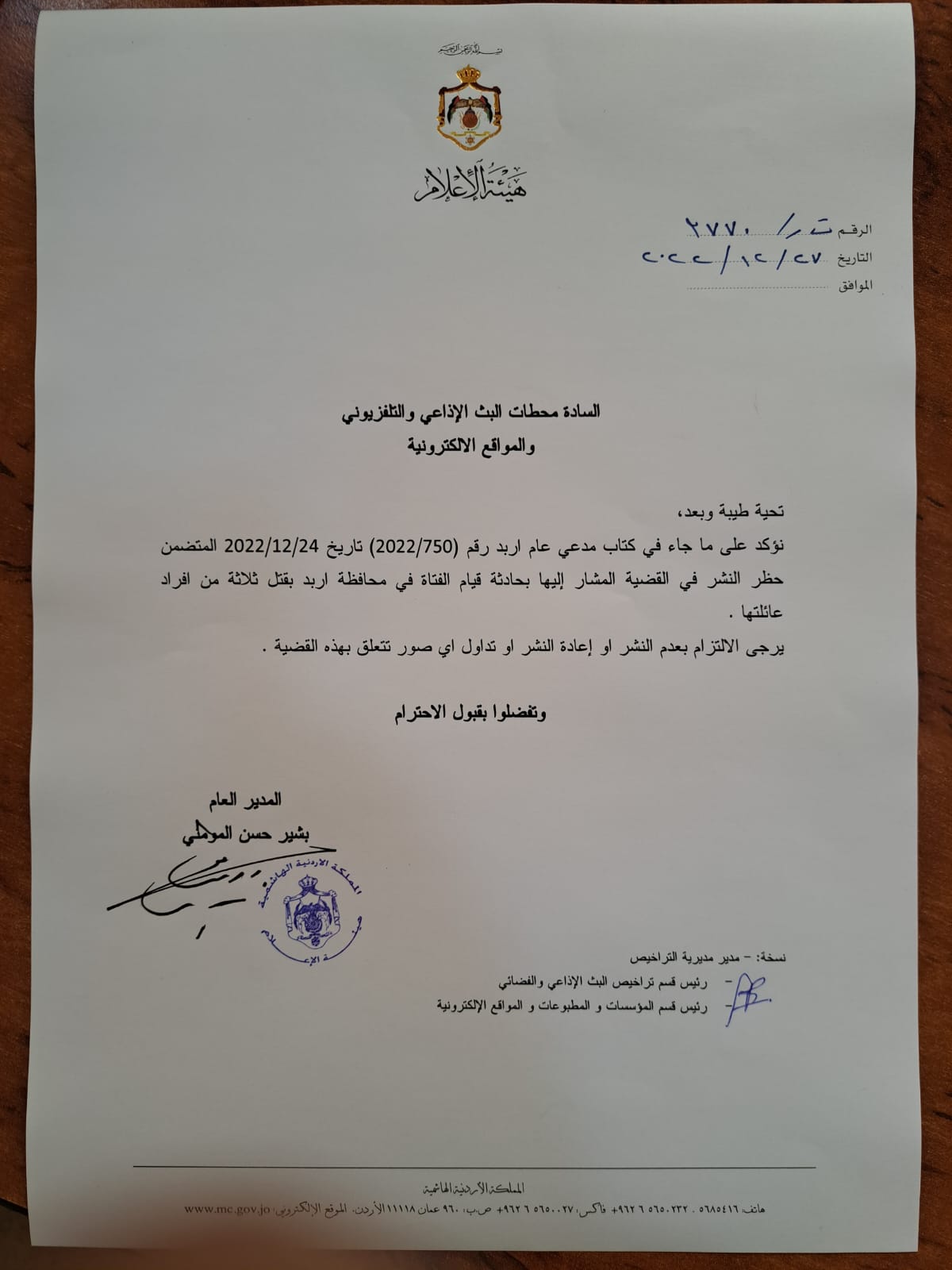 هيئة الإعلام تعيد التأكيد على عدم النشر بقضية جريمة إربد2022-12-27 12:27:30 -