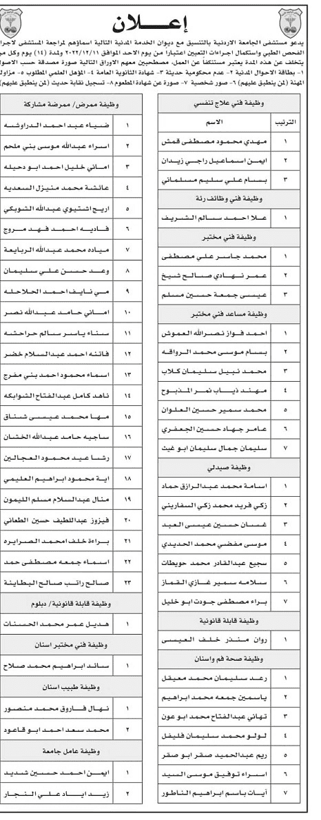 مدعوون لاستكمال إجراءات التعيين بمستشفى الجامعة الأردنية - أسماء2022-12-07 07:55:12 -