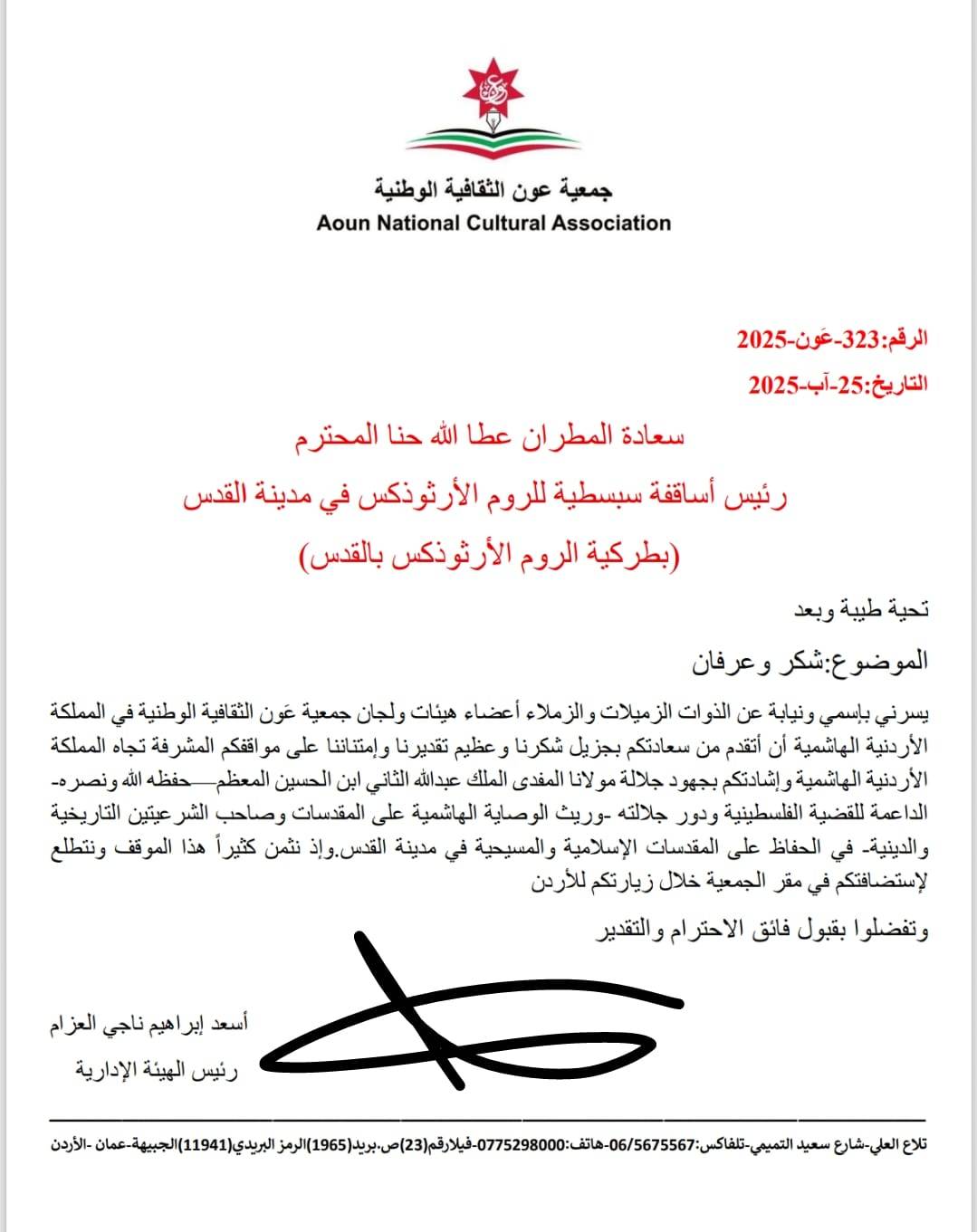 "جمعية عَون" تشكر المطران حنّا على موقفه المشرف تجاه الأردن