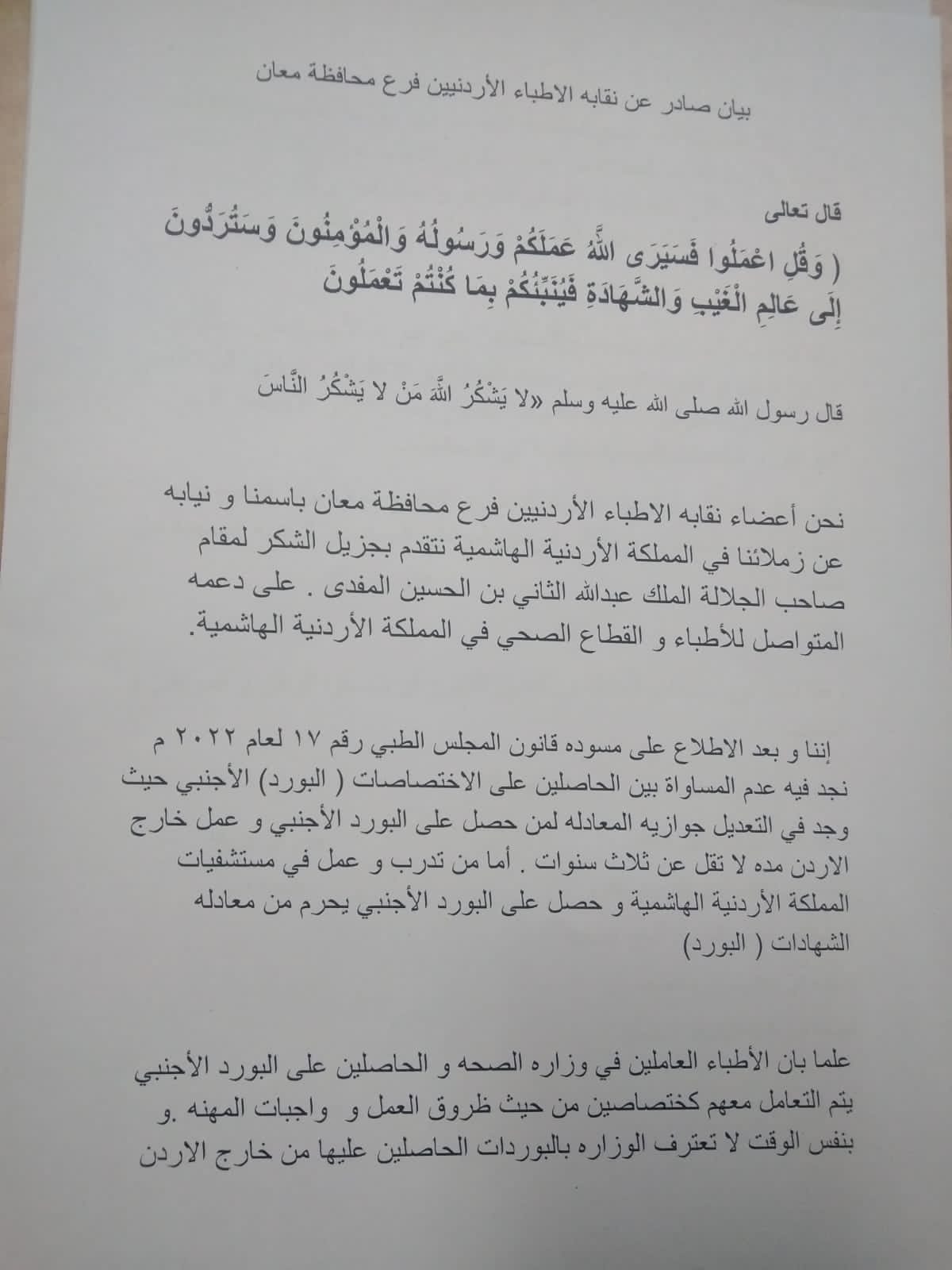 نقابة أطباء معان تنتقد مشروع قانون المجلس الطبي الأردني2022-08-10 11:43:42 -
