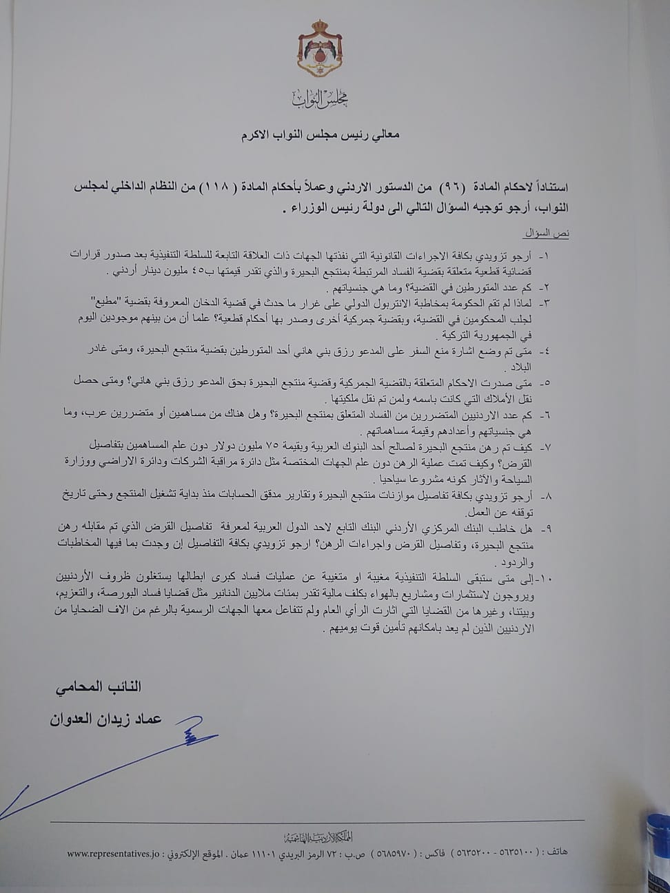 النائب عماد العدوان يسأل رئيس الوزراء عن قضية فساد بقيمة45مليون دينار2022-10-17 15:28:14 -