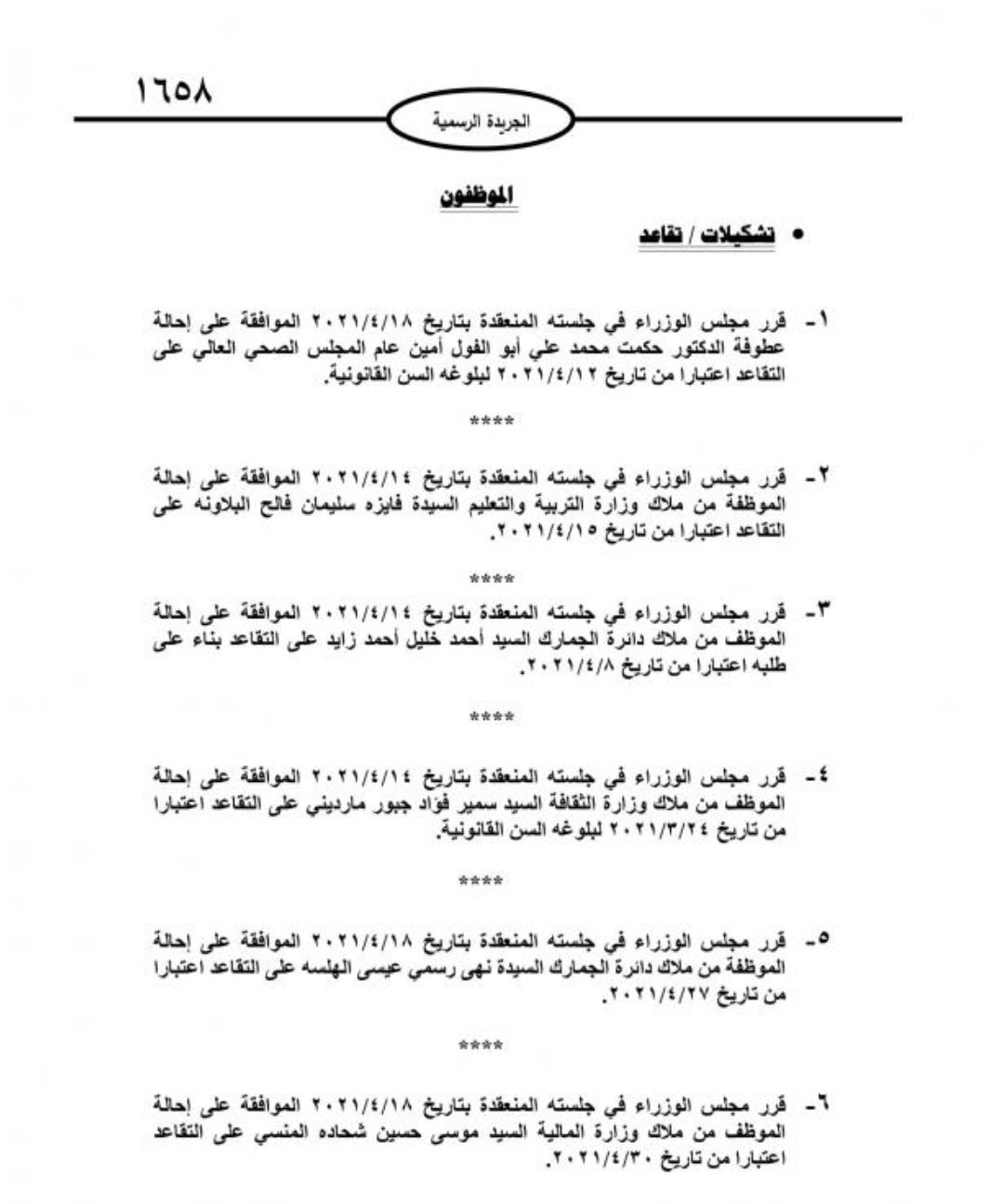 إحالة موظفين حكوميين الى التقاعد (أسماء)2021-05-02 19:13:50 -